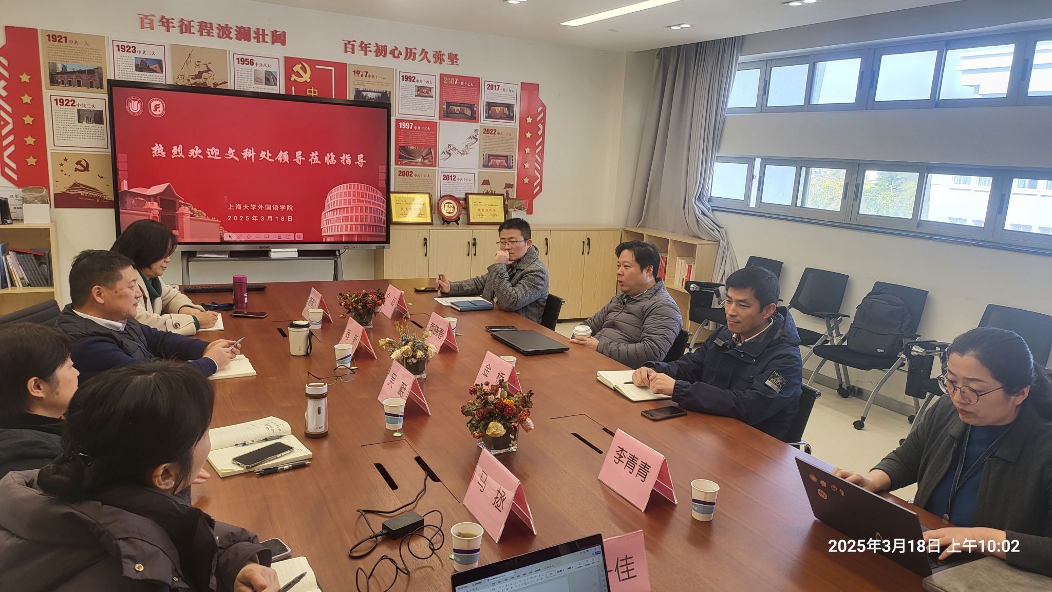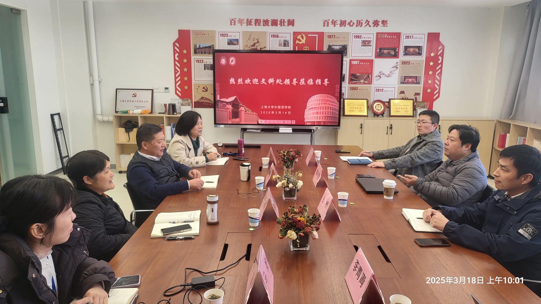 3月18日上午,春季学期第一周,上海大学科研管理部副部长、文科处处长黄晓春、文科处副处长金桥、副处长卢超和主管李青青一行赴外国语学院,于C412会议室召开文科调研会。外国语学院党委书记吴蔚、党委副书记、院长尚新、副院长唐青叶、英语系主任马拯、学院科研秘书朱一佳出席本次交流会。