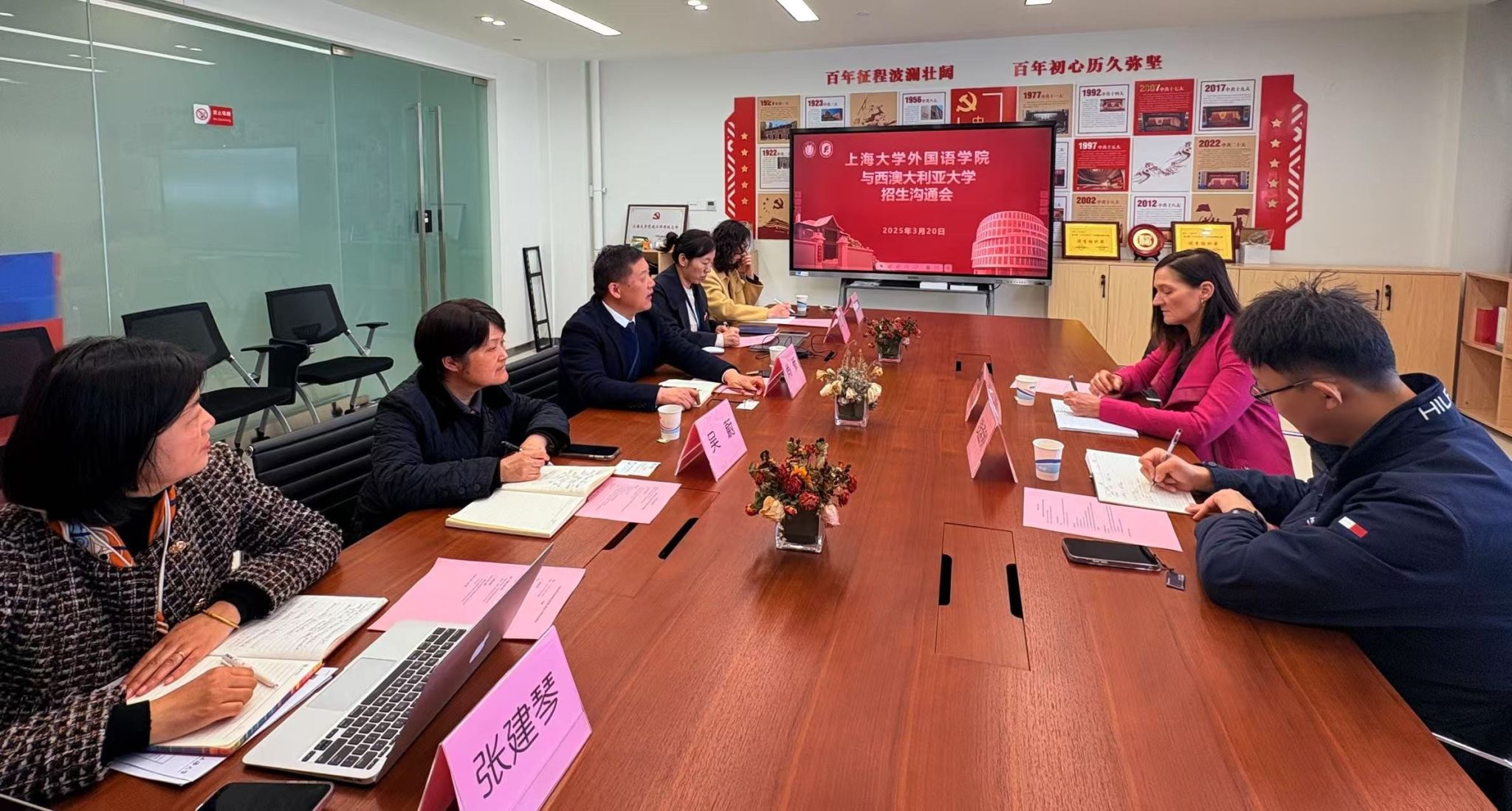 为进一步推动学院国际化进程,为学生提供更多优质的海外深造机会,3月20日上午11:00,上海大学外国语学院与西澳大利亚大学招生沟通会在宝山校区C412顺利举行。此次会议旨在就两校现有合作模式的具体招生情况进行深入交流,并探讨未来合作的拓展空间。会议由外国语学院副院长张建琴主持,学院党委书记吴蔚、党委副书记、院长尚新、英语系主任马拯、副主任张珊珊及外事秘书张晓娜出席。西澳大利亚大学国际处高级主任Rachel Darovic女士、西澳大学指定项目办公室负责人钱孟秋代表澳方参会。