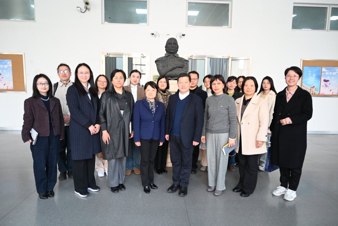 为推进AI赋能的外语教育教学改革,促进我校外国语言文学学科建设与人才培养高质量发展,2025年4月3日,外国语学院党委书记吴蔚、院长尚新带领学院班子成员及英语系、日语系主要负责人等赴上海外国语大学英语学院开展专题调研。调研会谈前,上海外国语大学副校长王欣教授热情探望了尚新院长一行。上海外国语大学英语学院党委书记杨雪莲、副院长孙会军、副院长陈琦、副院长程心、副书记曹姝婧、日语学院院长助理曾婧及相关负责人热情接待了调研团队一行并出席座谈。