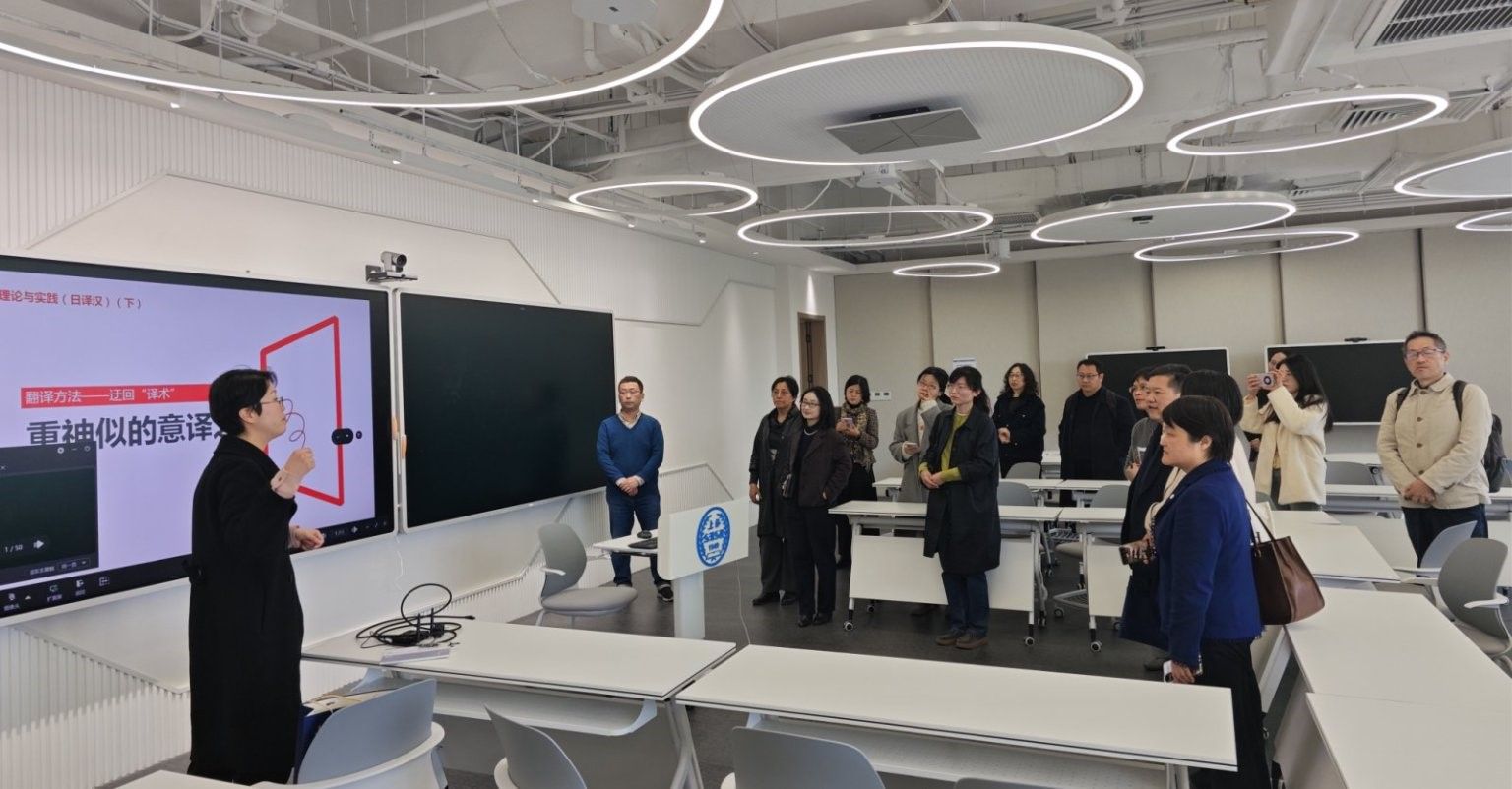 接着,双方围绕国家级一流英语专业建设展开讨论。上外英语学院介绍了“三进”工作、本-硕-博“一体化”培养、学生“个性化”培育、本科专业双学位设置、本科学生实践基地建设、学生海外交流政策与成效以及通过“课程群”建设整合资源的特色做法。上海大学外国语学院就新文科背景下课程体系优化、教材开发等问题进行针对性请教。针对人工智能技术赋能外语教育教学变革,调研团队深入考察上外英语学院在“AI+英语”领域的实践,包括智能写作评测系统应用以及语言数据科学课程建设情况,并实地考察了上海外国语大学"未来教学空间"智慧教室,现场观摩了智能技术支撑下的新型教学模式。双方还就技术伦理、师生数字素养提升等议题交换了诸多见解和做法。