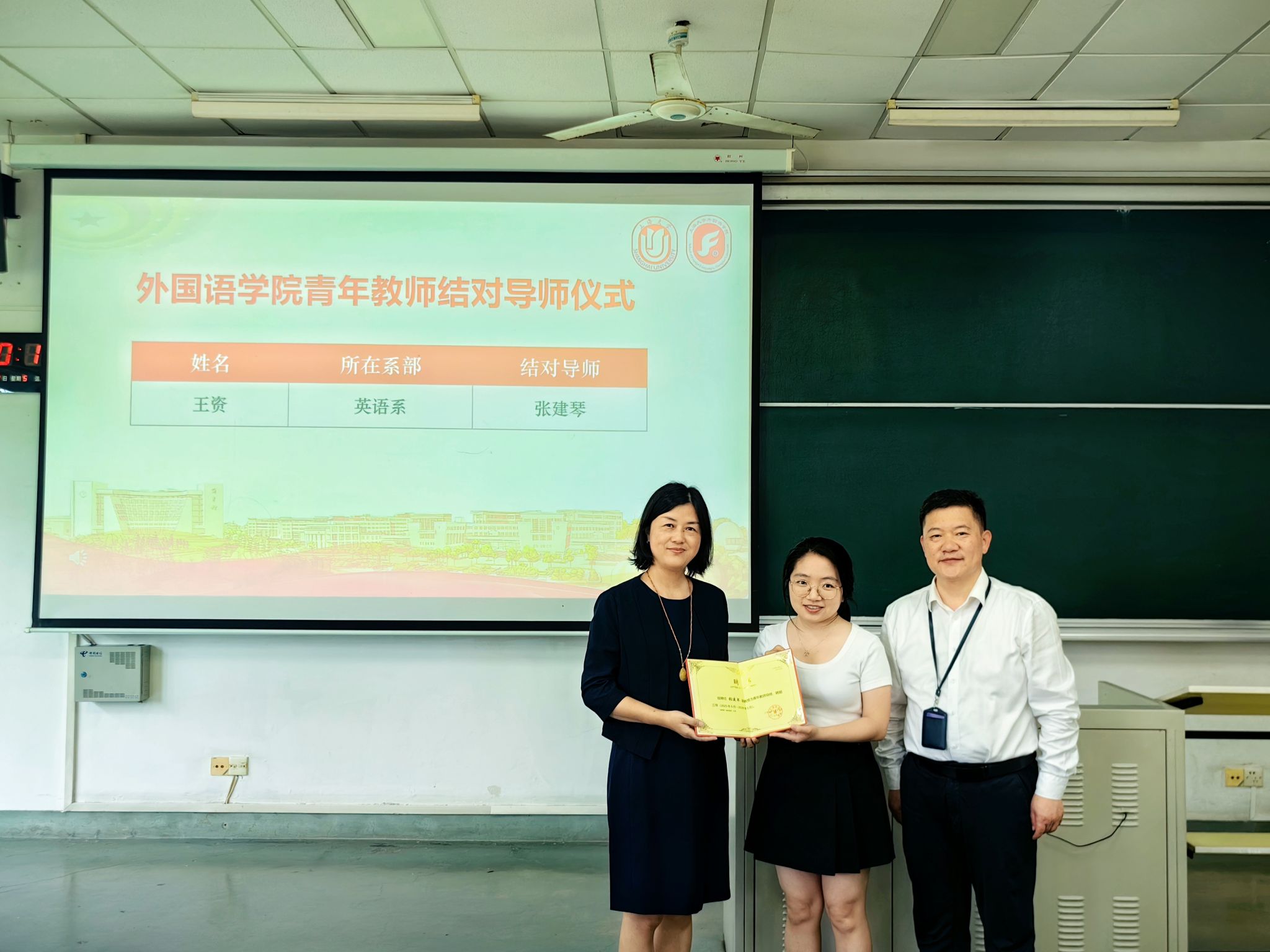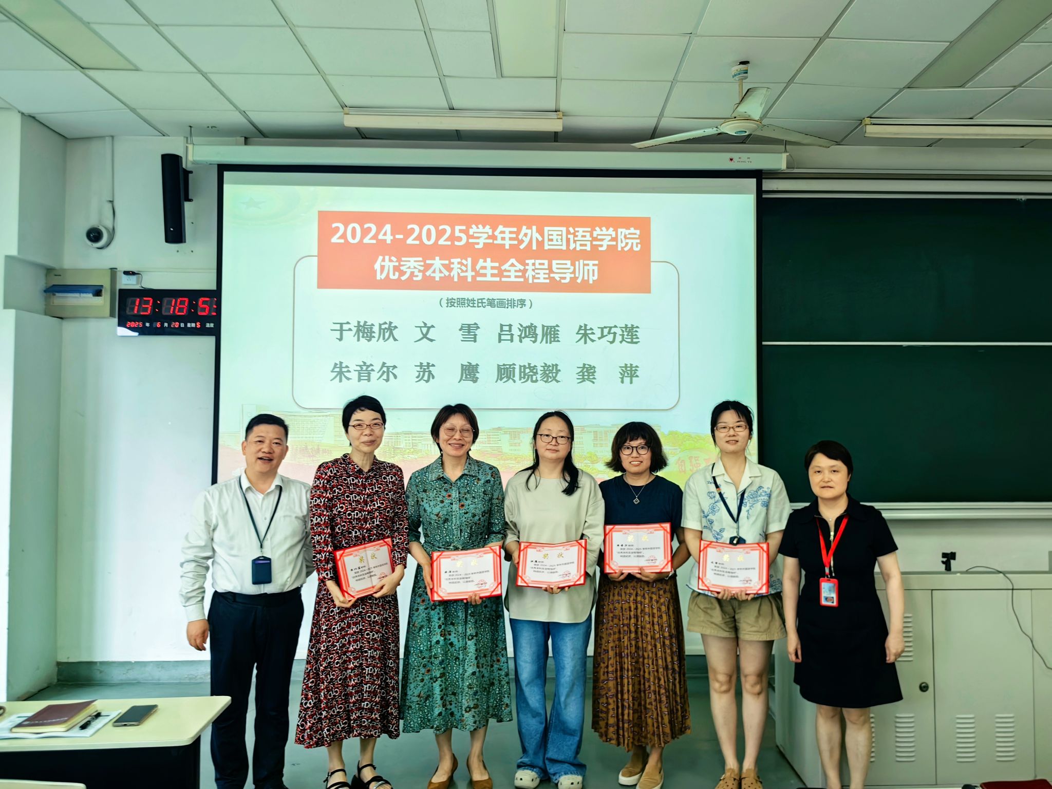 会议伊始,学院党委副书记、院长尚新向全体教职工隆重介绍了新入职的陈友骏教授与陆彩玲副教授,并主持了新进教师王资博士与张建琴副教授的导师结对仪式,进一步强化“以老带新、以新促强”的人才培养机制。吴蔚书记和尚新院长共同为 2024-2025 学年“优秀本科生全程导师”颁发奖状,以表彰本学年优秀全程导师在育人工作中的突出表现。