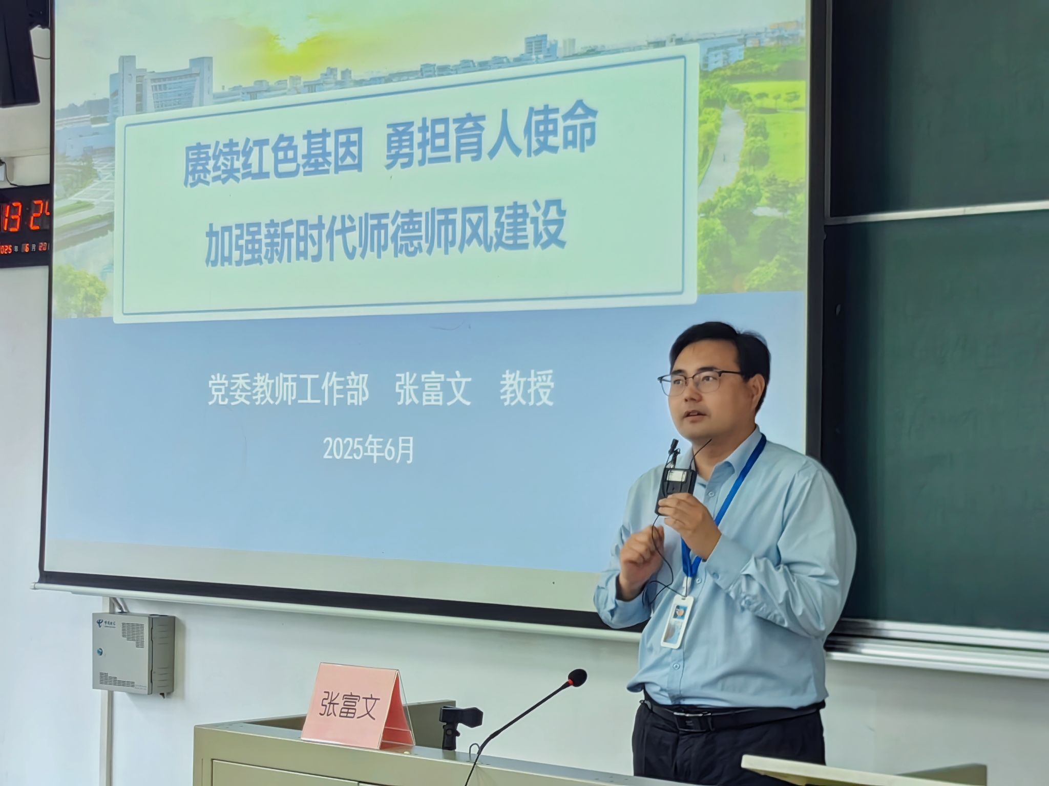 随后,党委教师工作部副部长张富文教授以 “赓续红色基因 勇担育人使命——加强新时代师德师风建设” 为题开展专题讲座。张部长从新时代师德建设的背景出发,深度结合 “百年红色基因”、“钱伟长教育思想” 及 “城市命名高校” 上海大学“三宝”,同时围绕师德警示教育案例进行了生动详实而又深度地剖析,强调教师需坚守教育初心,以爱国奋斗精神投身教育事业。张部长特别指出,创建世界一流大学的征程中,高尚师德是基石,每位教师都应恪守职业底线,为学校发展贡献自身力量。