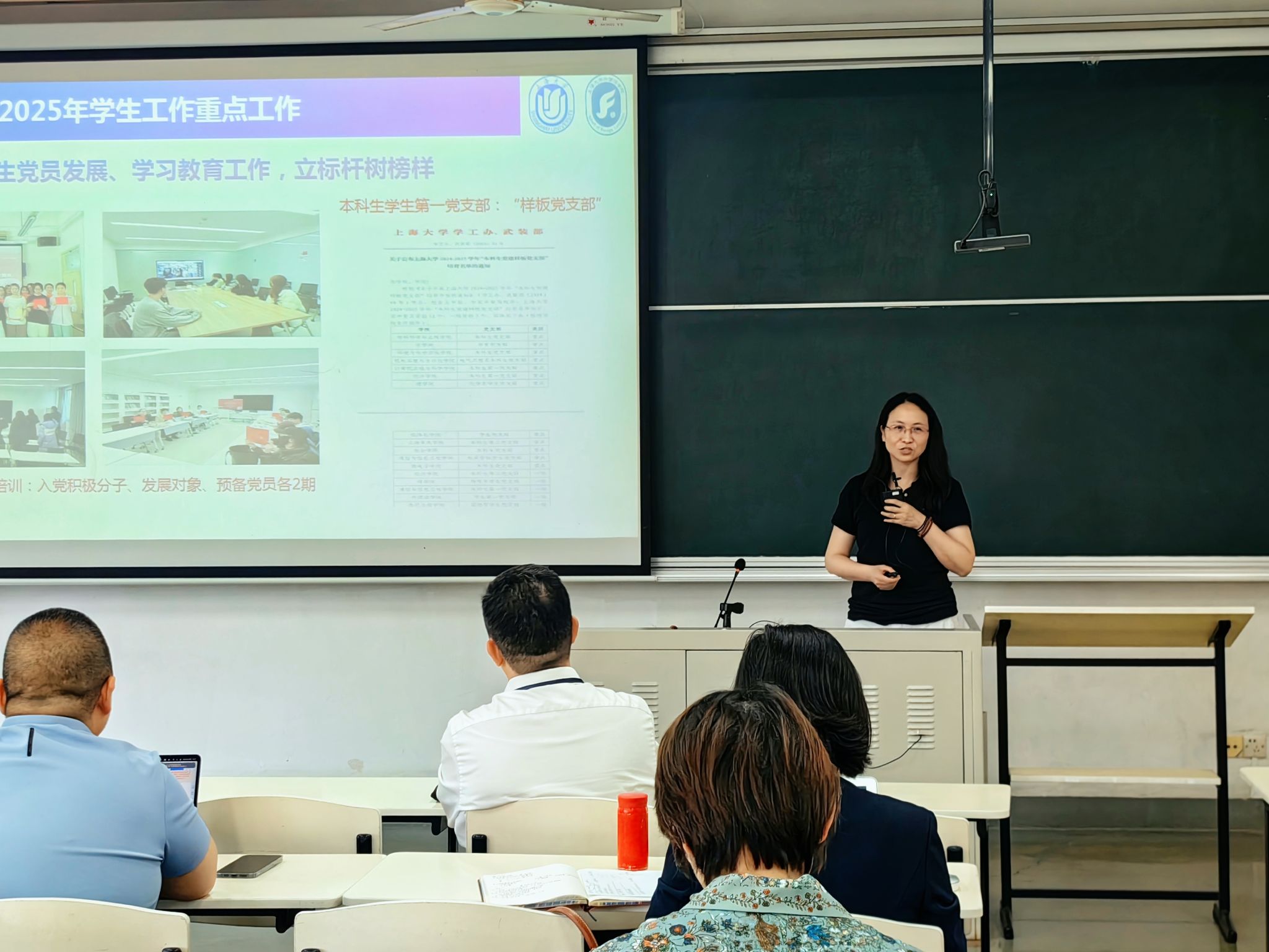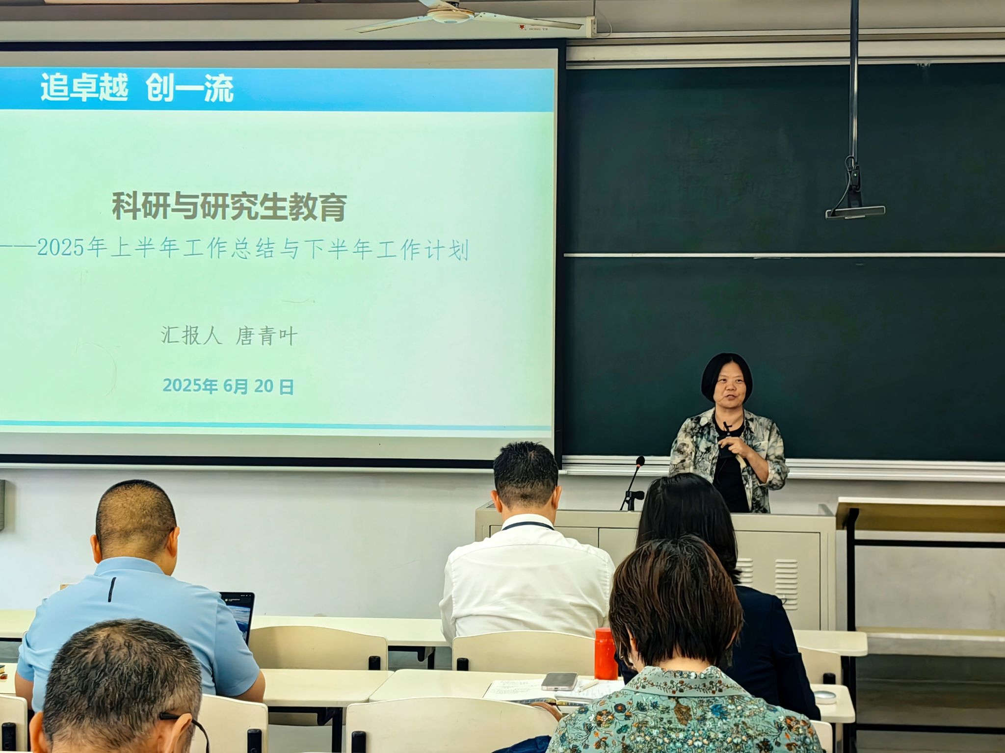 副院长唐青叶围绕科研和研究生工作,对 2025 年学院项目申报情况进行了全面的统计分析汇报。她通过数据对比,详细介绍了研究生论文盲审情况、招生情况、研究生培养方案的修订以及系统建课和学生对课堂教学反馈等情况,并对下半年相关工作进行了科学规划。
