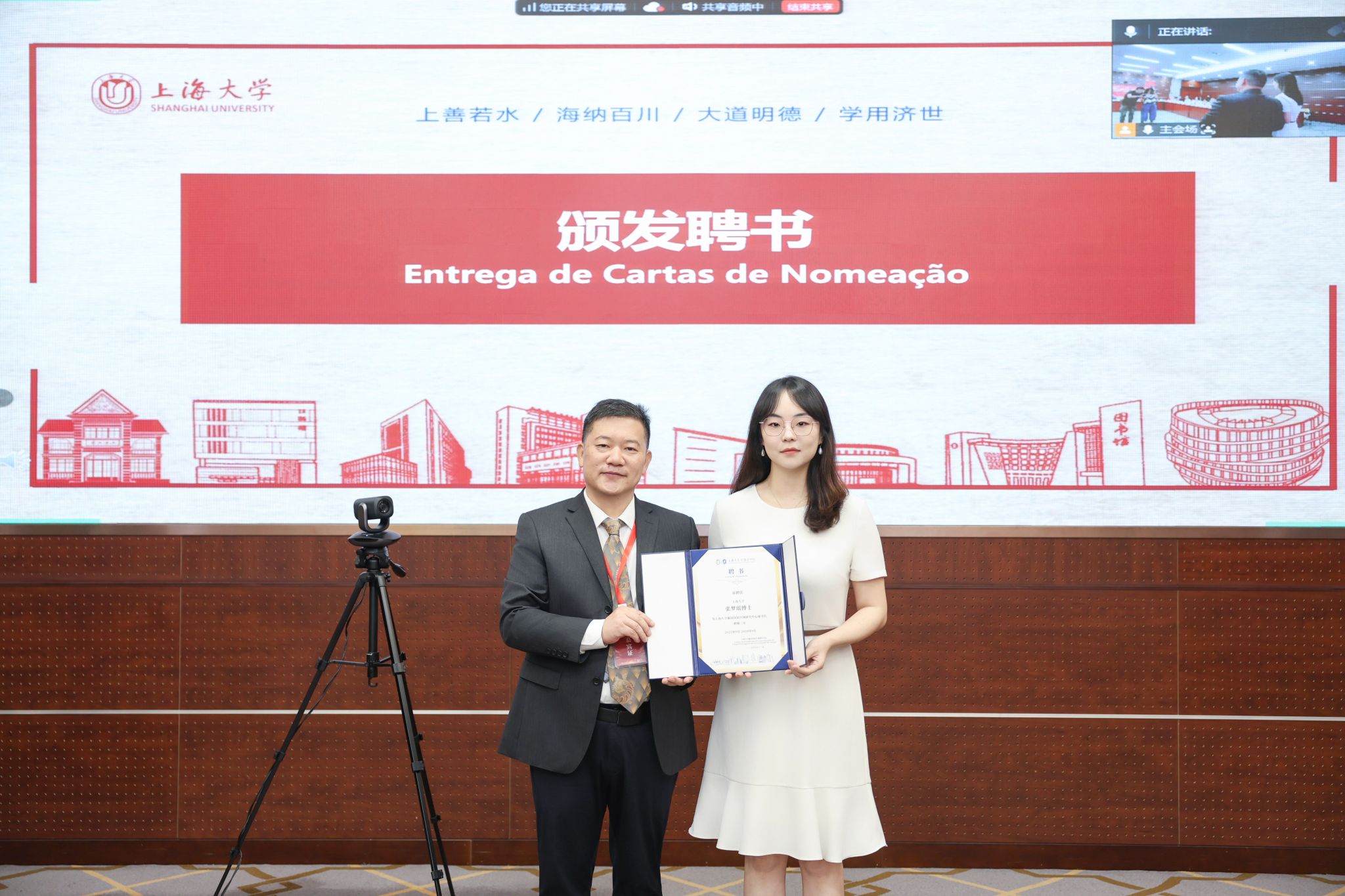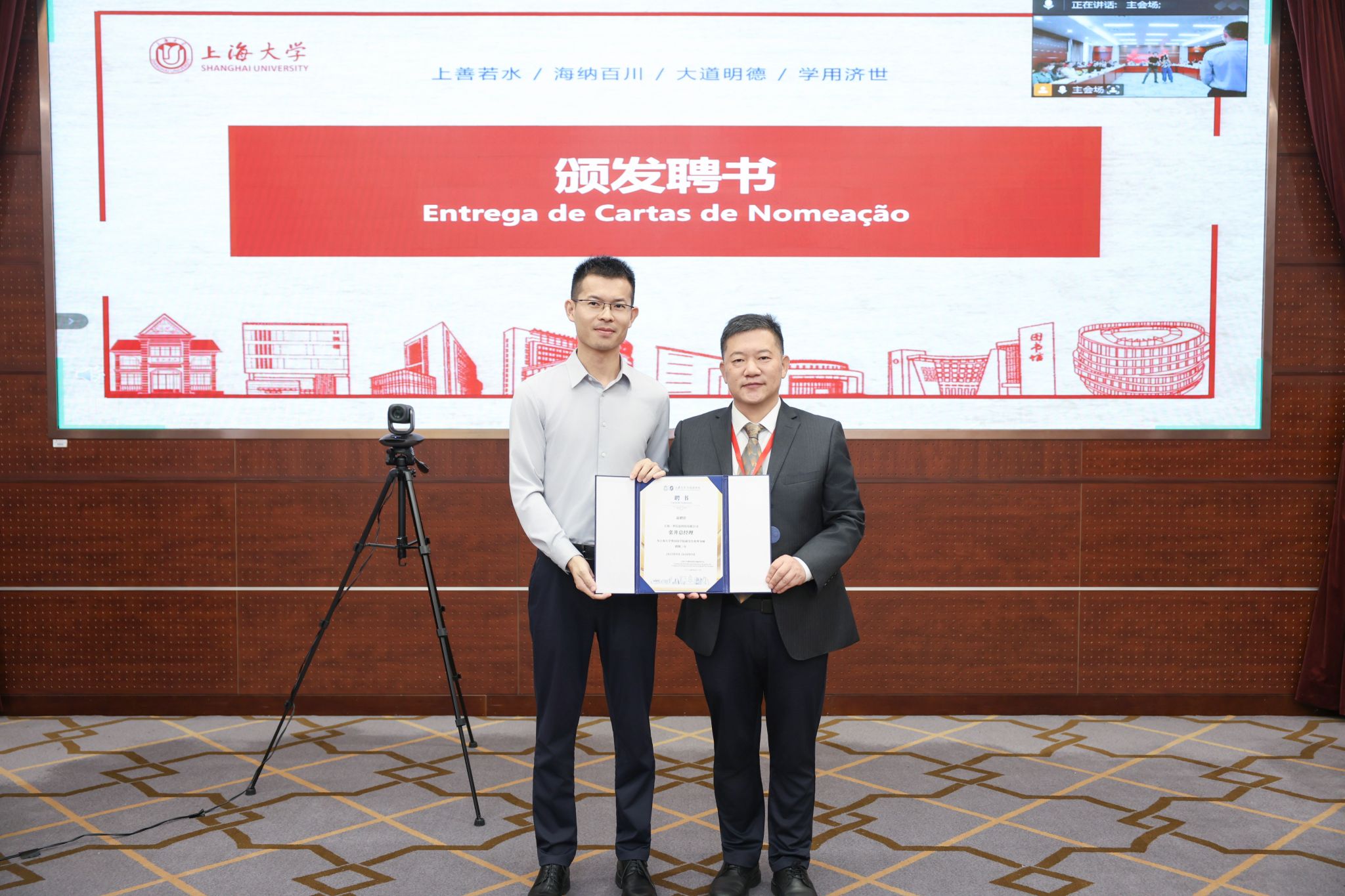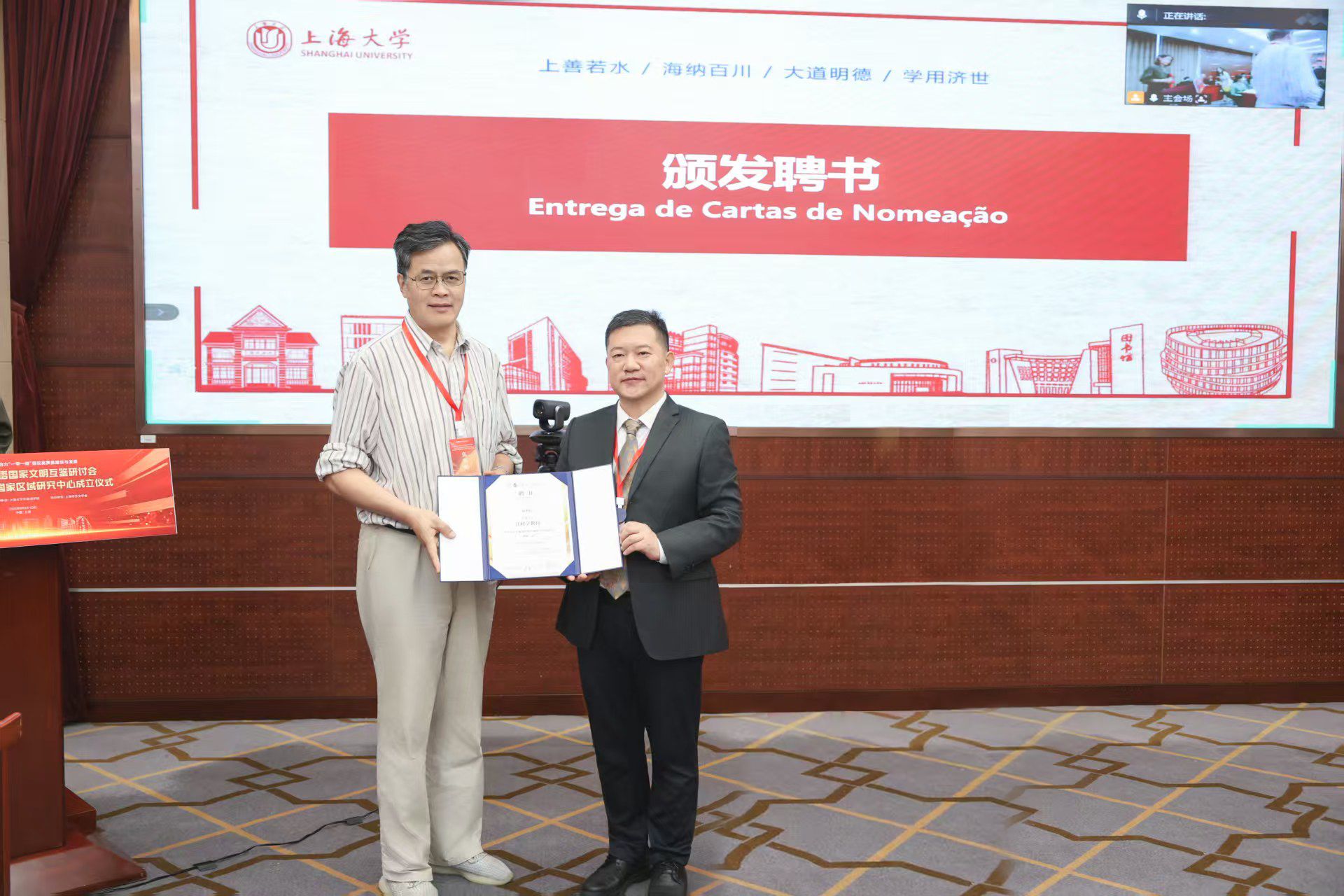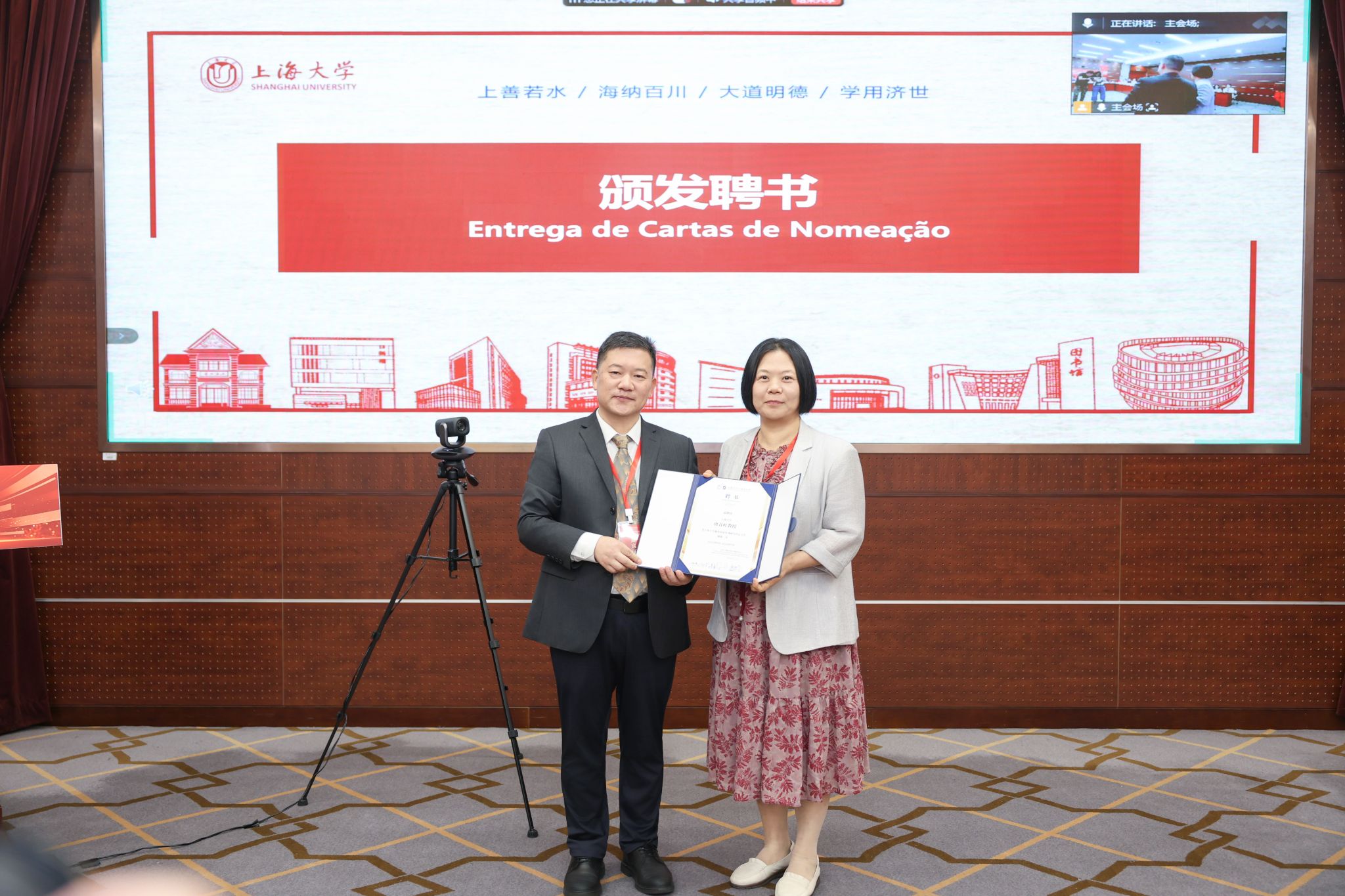 仪式现场,尚新为受聘专家颁发聘书,聘任江时学教授为上海大学葡语国家区域研究中心顾问、唐青叶教授为中心主任、张梦瑶博士为中心秘书长、张井总经理为校外导师。