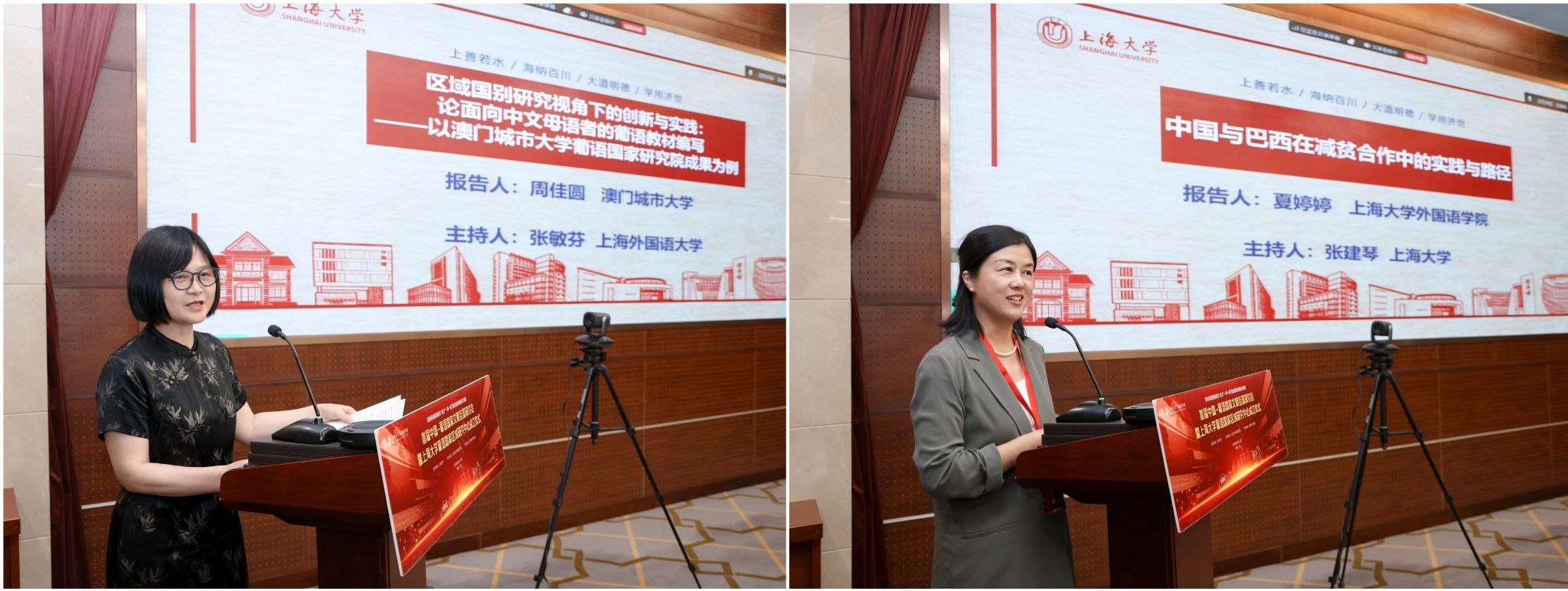 随后的小组报告分别由上海外国语大学葡语系教授张敏芬与上海大学外国语学院副院长张建琴主持。澳门城市大学葡语国家研究院周佳圆,安徽师范大学郎思达,上海一者科技有限公司刘艳丽,上海大学文学院尹淇,上海大学外国语学院张梦瑶、夏婷婷、高荪琳、倪珮玥分别作了研讨报告,并围绕中巴合作与中国减贫经验、葡语人才培养及人工智能科研赋能等方面展开讨论。