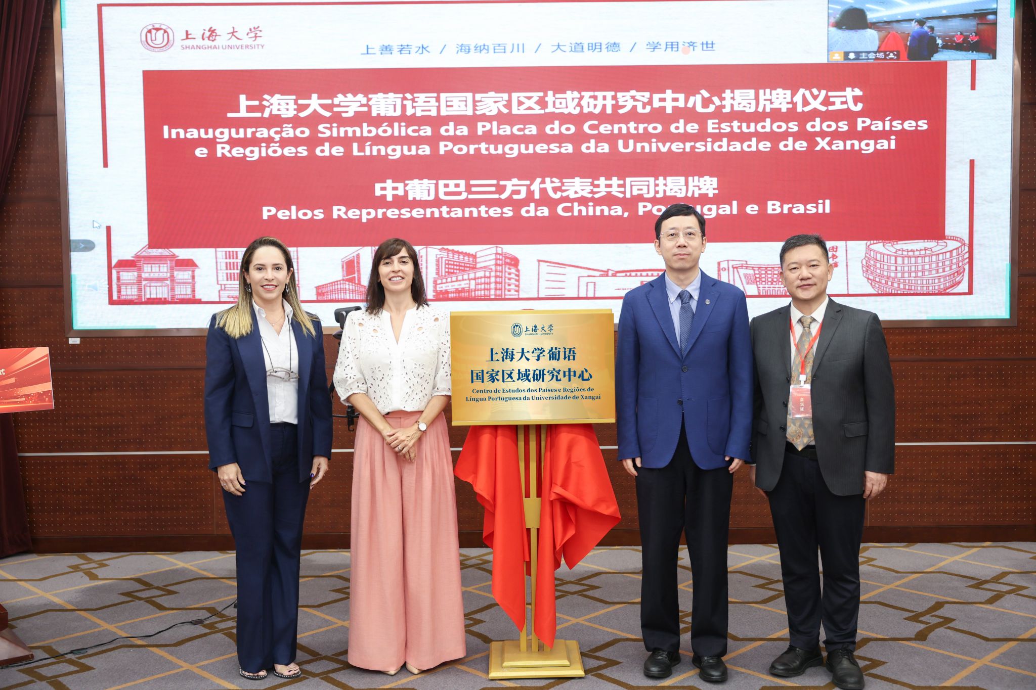夏思雅(Sílvia Inácio)、马丽莉亚(Marília Meneses)、段勇、尚新共同为上海大学葡语国家区域研究中心揭牌。