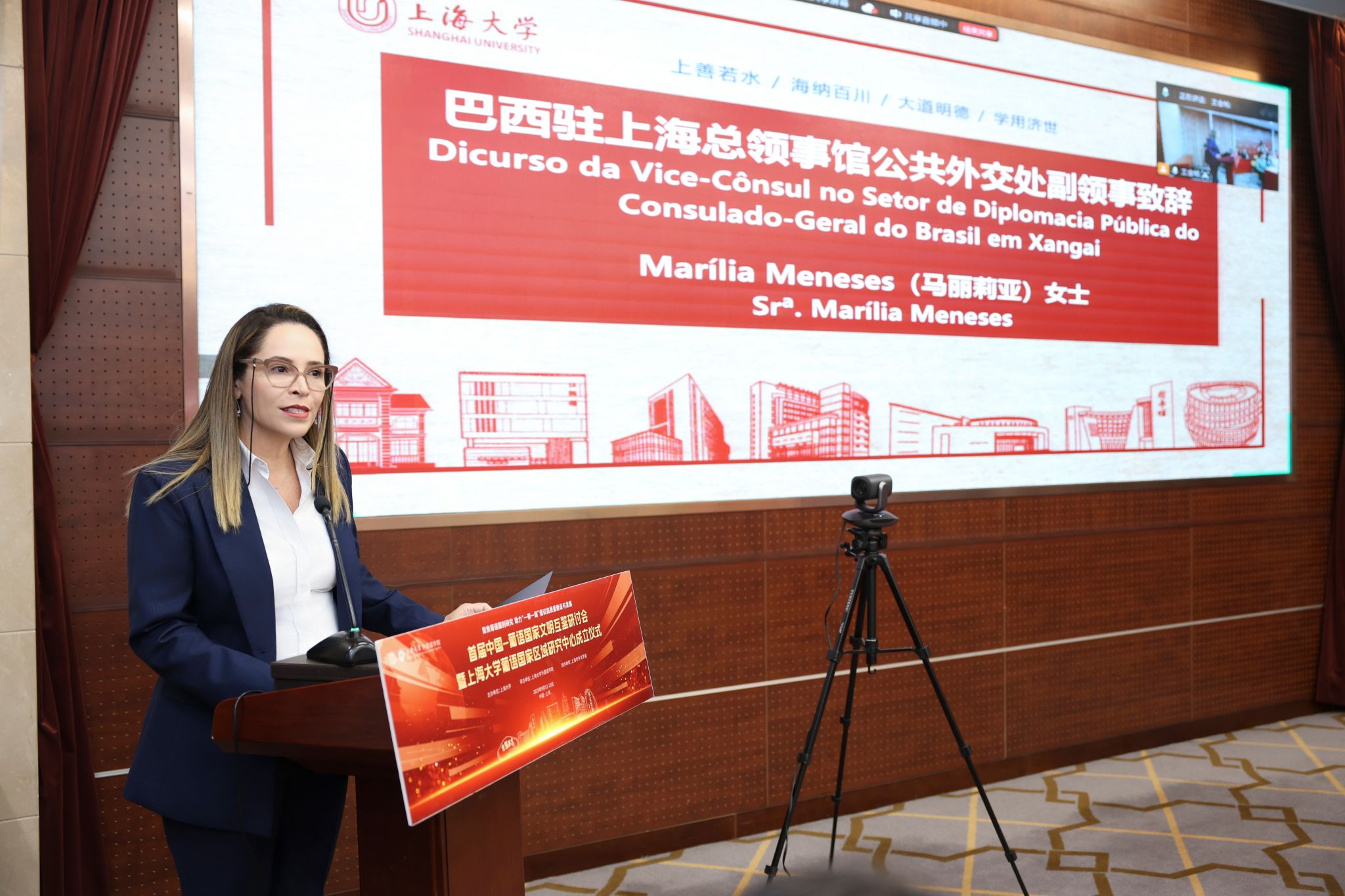 马丽莉亚(Marília Meneses)在致辞中引用葡萄牙语名家的经典文学作品,呈现葡语之美与多样性,她回顾了2023年上海大学与巴西巴伊亚联邦大学联合成立巴伊亚联邦大学孔子学院,并展望了将于2026年举办的中巴文化年。她相信,葡语国家区域研究中心的成立,将进一步促进跨文化对话与学术合作,助力中巴关系广泛持久和互惠发展。她期待以两国之间的友谊为桥梁,双方在文化、文学、经济、脱贫合作等领域开展更深层次的交流合作。