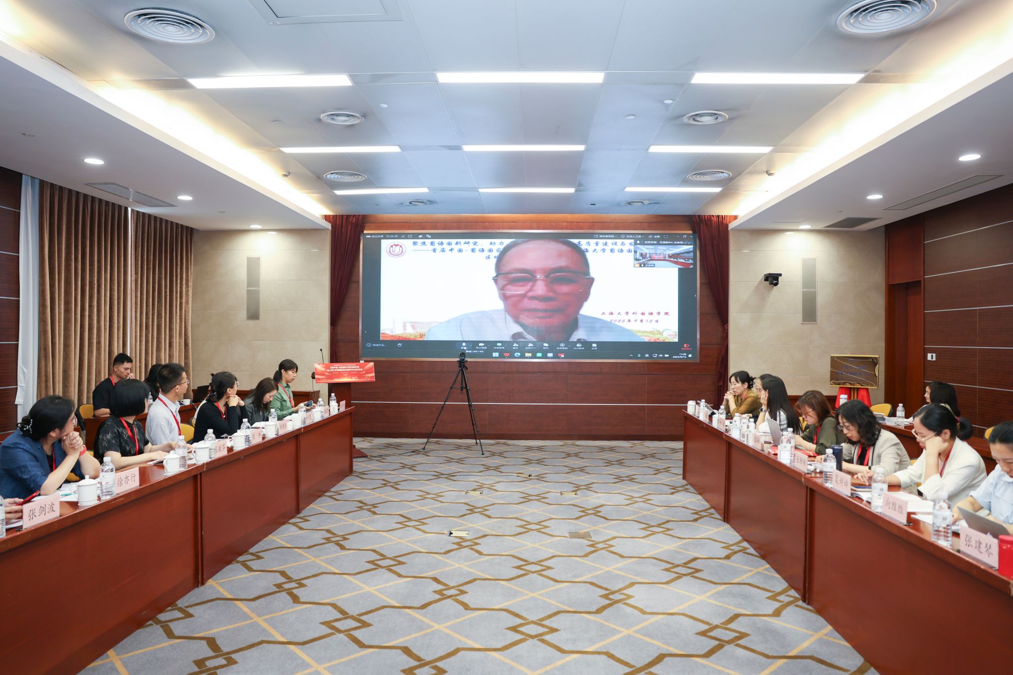 葡萄牙驻上海总领事馆总领事夏思雅(Sílvia Inácio),葡萄牙驻上海总领事馆商务参赞陆叶斯(Luis Costa),巴西驻上海总领事馆公共外交副领事马丽莉亚(Marília Meneses),上海大学党委副书记段勇,澳门城市大学副校长叶桂平,中国-葡语国家经贸合作论坛(澳门)前秘书长王成安,上海大学拉丁美洲研究中心主任、上海大学特聘教授江时学,上海大学里斯本学院葡方副院长Pedro Silva Girão,澳门大学人文学院葡文系系主任韦如航(João Veloso),上海外国语大学葡语系副系主任徐亦行、教授张敏芬,中国传媒大学外国语言文化学院副教授、区域国别传播研究院巴西研究中心主任颜巧容,上海一者信息科技有限公司总经理张井,上海外语教育出版社多语部副主任许一飞等嘉宾,来自对外经济贸易大学、中国传媒大学、澳门大学、澳门城市大学、安徽师范大学和上海大学葡语国家区域研究中心的专家学者及师生代表,上海大学国际部、科研管理部(文科处)、里斯本学院的相关负责人,上海大学外国语学院院系领导和师生代表出席本次研讨会。开幕式由上海大学外国语学院党委副书记、院长尚新主持。
