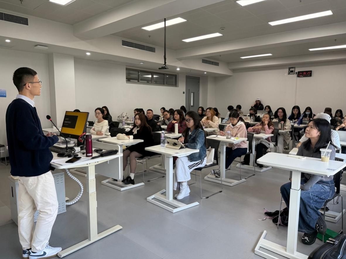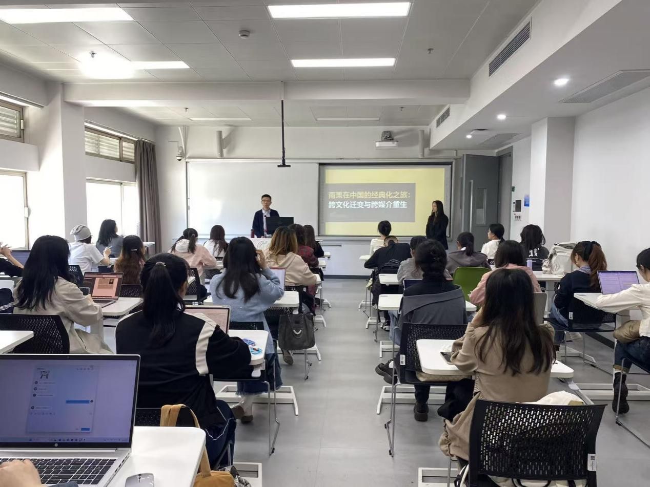 2025年10月24日下午1点,法语系在宝山校区B325教室举办了“中国与法语世界”系列讲座第六讲,邀请南京大学外国语学院法语系准聘副教授吴天楚老师为法语系师生开展题为“雨果在中国的经典化之旅:跨文化迁变与跨媒介重生”的讲座。讲座由法语系教师赵倩博士主持,法语系教师王嘉源、顾晓毅以及三十多位本硕同学共同参与。讲座内容丰富充实,现场互动热烈,学生提问积极,取得了圆满成功。