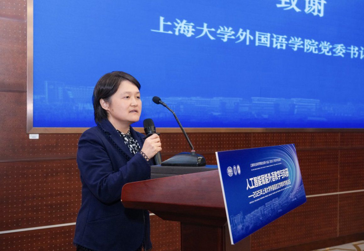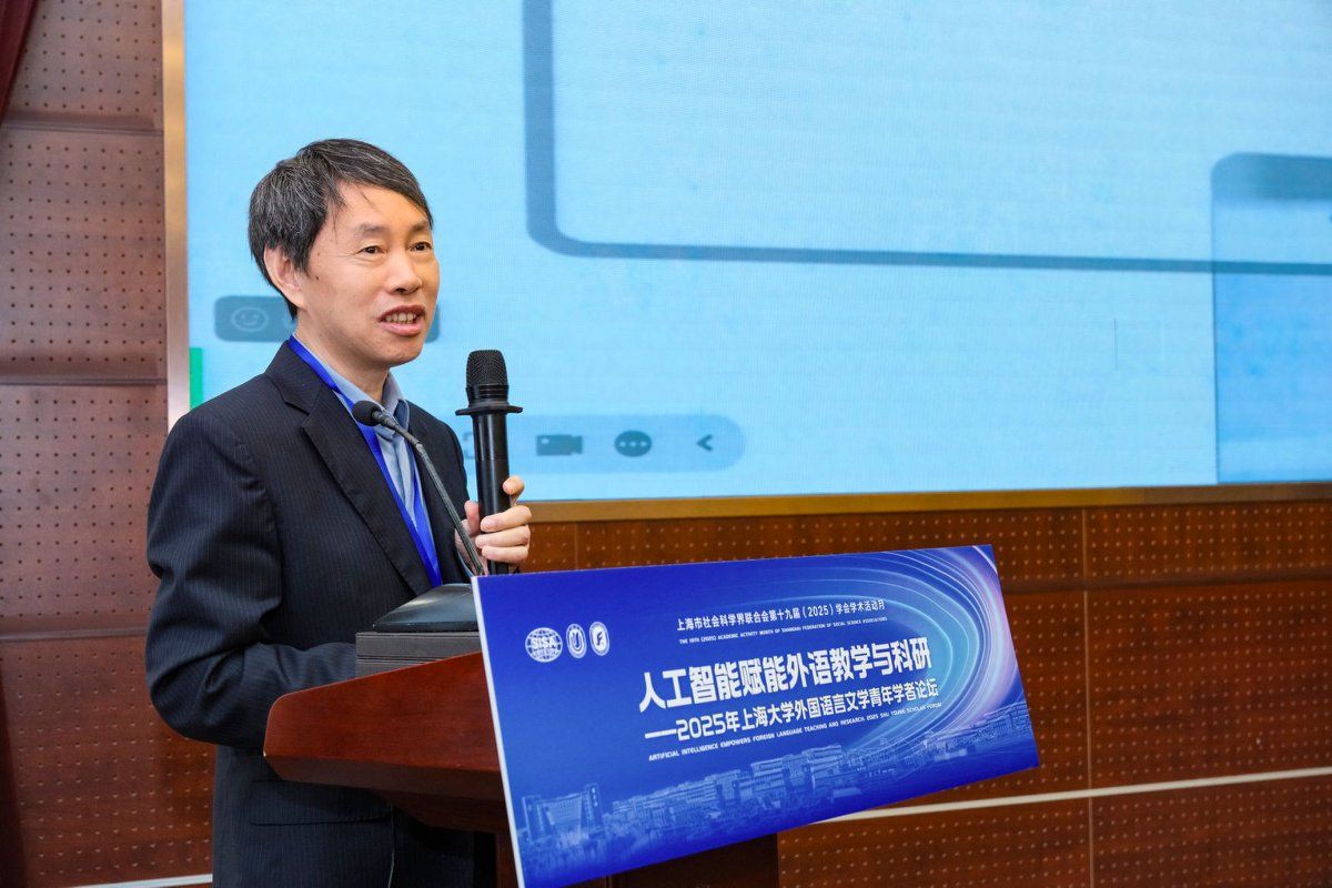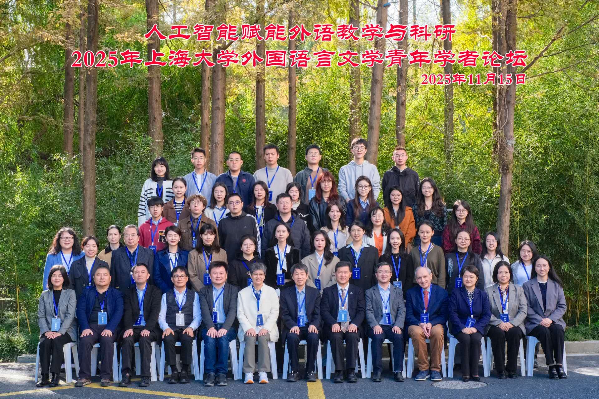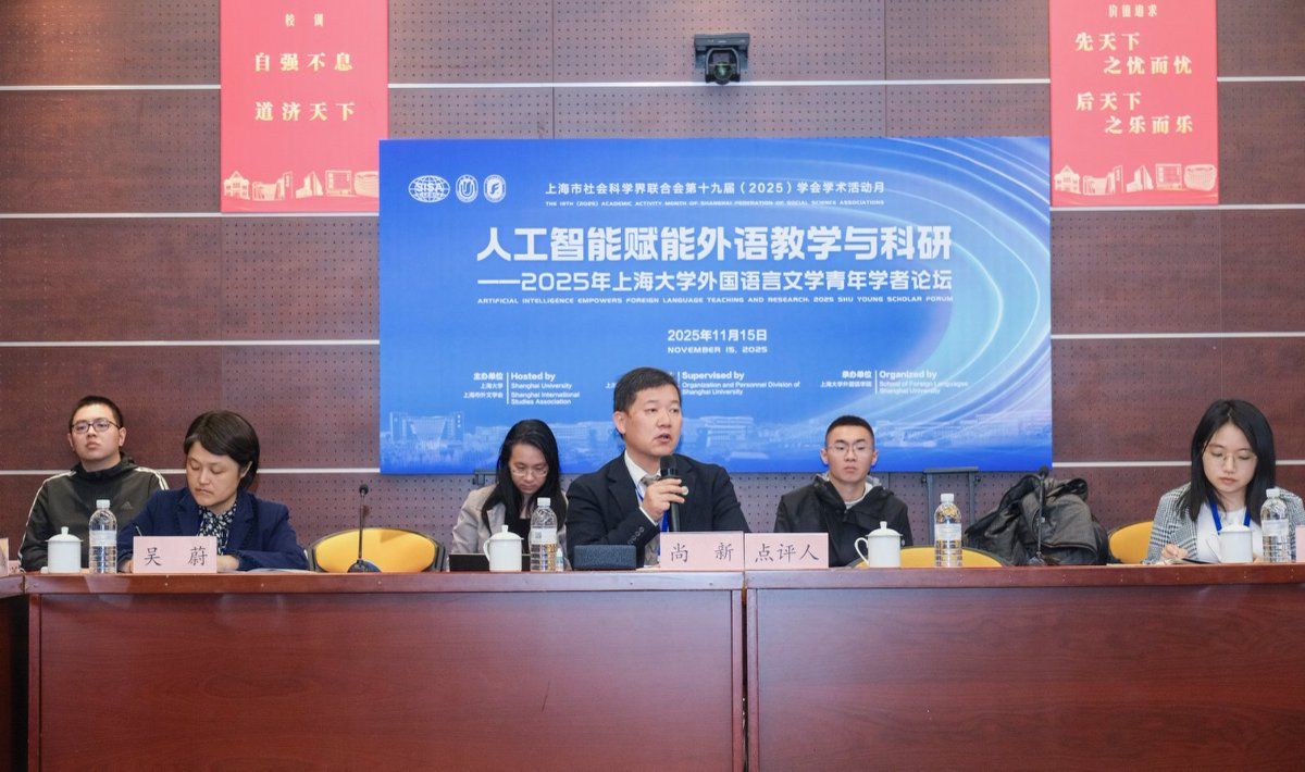 11月15日,“人工智能赋能外语教学与科研—2025年上海大学外国语言文学青年学者论坛”在上海大学宝山校区乐乎新楼举行。本次论坛作为上海市社会科学界联合会第十九届(2025)学会学术活动月系列活动之一,由上海大学、上海市外文学会主办,上海大学组织人事部人事处指导,上海大学外国语学院承办。十四届全国政协常委、原西安外国语大学校长户思社,上海市社会科学界联合会学会管理处调研员卢红青,上海大学组织人事部人事处副处长邓小勇,上海大学组织人事部人才办副主任张舜卿,上海外文学会副会长、上海大学外国语学院党委副书记、院长尚新,华东师范大学出版社高教与职教分社副社长李恒平,上海大学特聘教授玉冈贺津雄,美国俄亥俄州立大学Robert Levine,以及来自北京大学、浙江大学、东南大学、南京大学、复旦大学、上海交通大学、同济大学、华东师范大学、上海外国语大学、上海大学、美国南加州大学、比利时根特大学等15所高校的27位青年学者出席,外国语学院全体党政班子、系部主任、青年师生代表参加此次论坛。论坛开幕式由上海大学外国语学院副院长唐青叶教授主持。