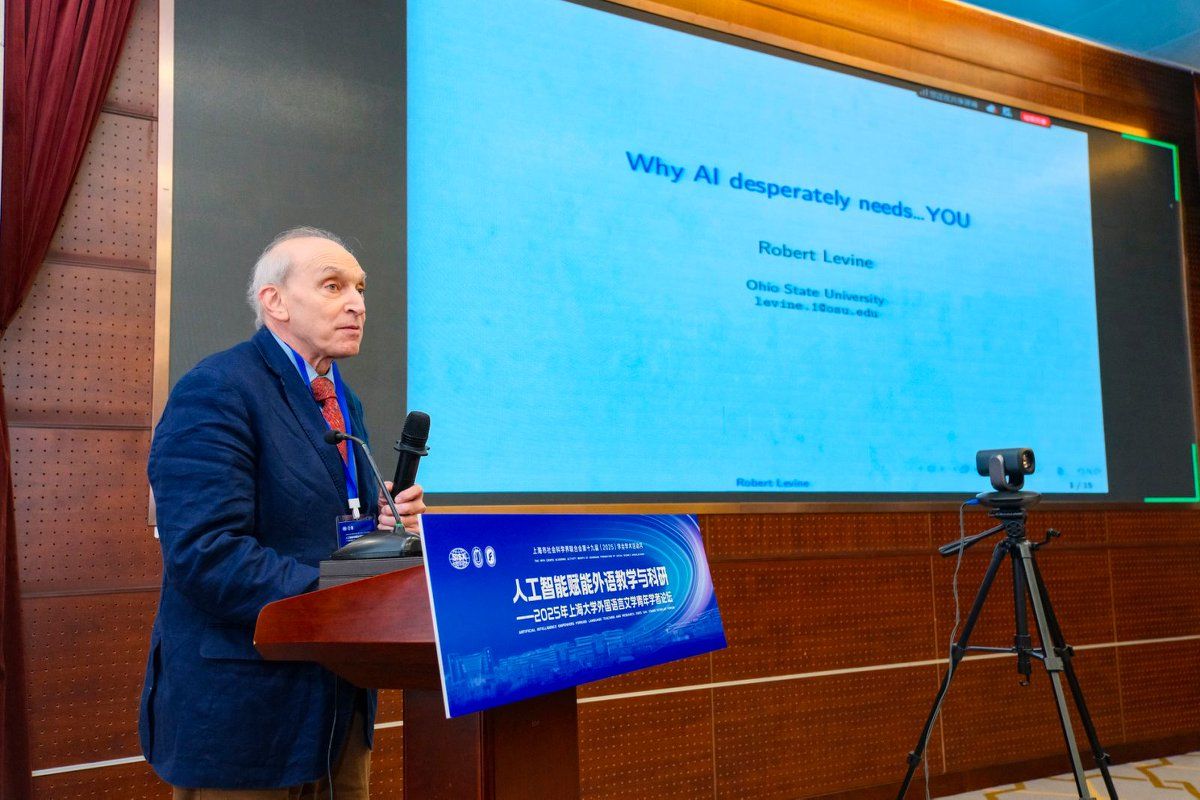 上午三场主旨报告分别由上海大学外国语学院英语系主任马拯副教授、日语系副主任苏鹰教授和院长尚新教授主持。美国俄亥俄州立大学Robert Levine教授作题为“Why AI desperately needs…YOU?”的报告,深度探讨了人工智能时代下人类不可替代的核心价值,他强调,在需要深度解读、批判性思维和人文关怀的领域,AI无法取代人类的角色,AI的发展过程中仍然需要人类的参与。