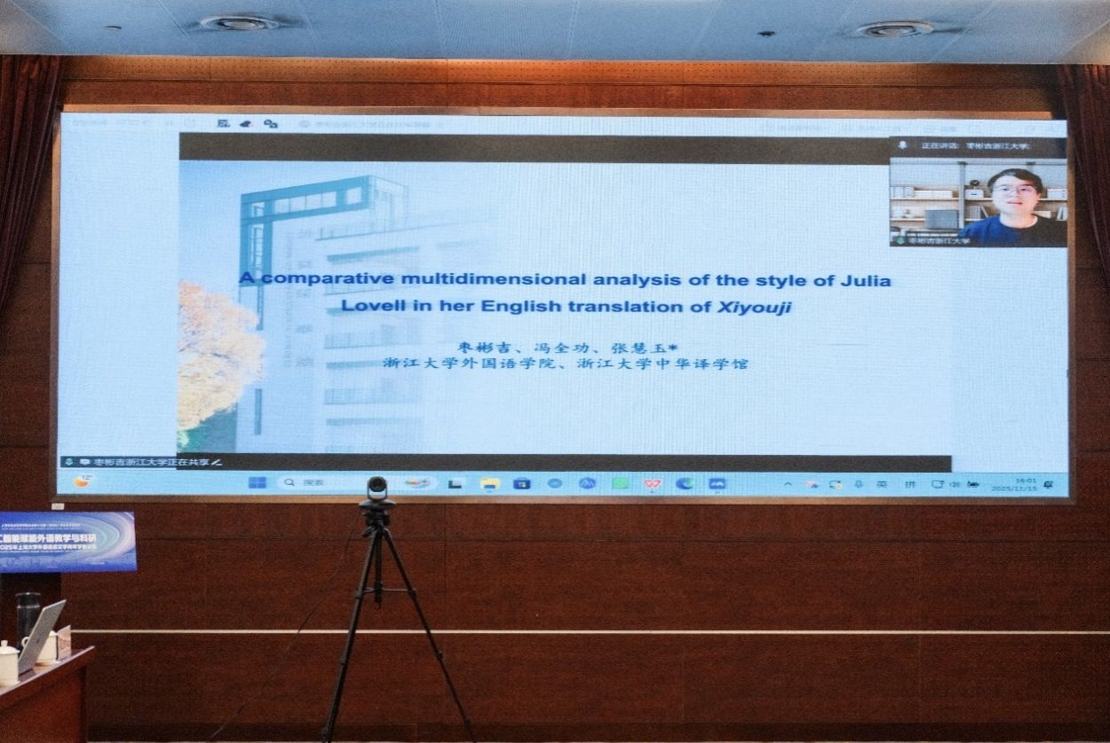 下午两场主旨报告分别由上海大学外国语学院副院长戴朝晖副教授和英语系主任马拯副教授主持。浙江大学枣彬吉博士以朱莉娅·洛威尔英译《西游记》为对象,采用语料库驱动的多维度比较方法,通过跨译者和同译者两条路径,探讨译者风格的可识别性及其形成机制。其研究成果不仅证实译者风格对翻译实践的关键影响,更为翻译风格学特别是译者视觉可见性研究提供了新的理论视角与方法路径。