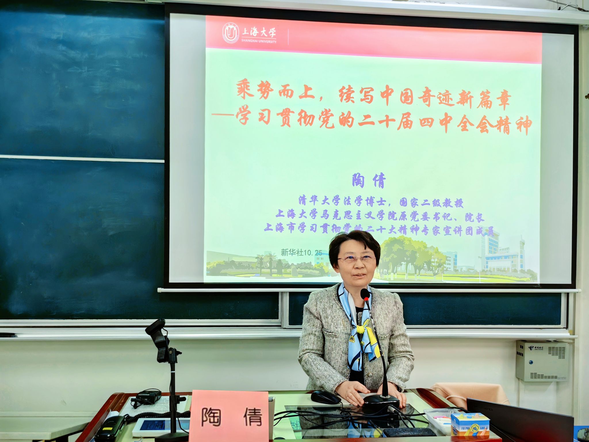 为深入学习贯彻党的二十届四中全会精神,切实把全院师生的思想和行动统一到党中央决策部署上来,12月12日下午,外国语学院在宝山校区BJ207召开全院教职工大会暨党的二十届四中全会精神专题讲座,特邀上海大学学习贯彻党的二十届四中全会精神理论宣讲团专家组成员、上海大学伟长学者、马克思主义学院教授陶倩作专题讲座,外国语学院党政领导班子、全体教职工齐聚一堂,百余名学生线上参会。会议由学院党委书记吴蔚主持。