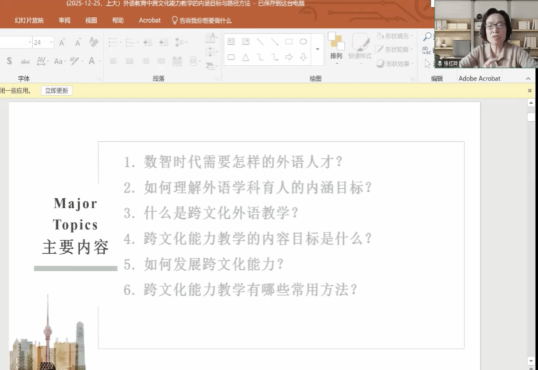 12月25日上午,上海大学外国语学院“语言文化与世界文明系列讲座”第一百四十八期成功在线上举办。本次讲座特邀上海外国语大学张红玲教授作题为“外语教育中的跨文化能力:内涵目标与路径方法”的专题分享,吸引了八十余名师生云端参与。讲座由上海大学外国语学院副院长张建琴副教授主持。