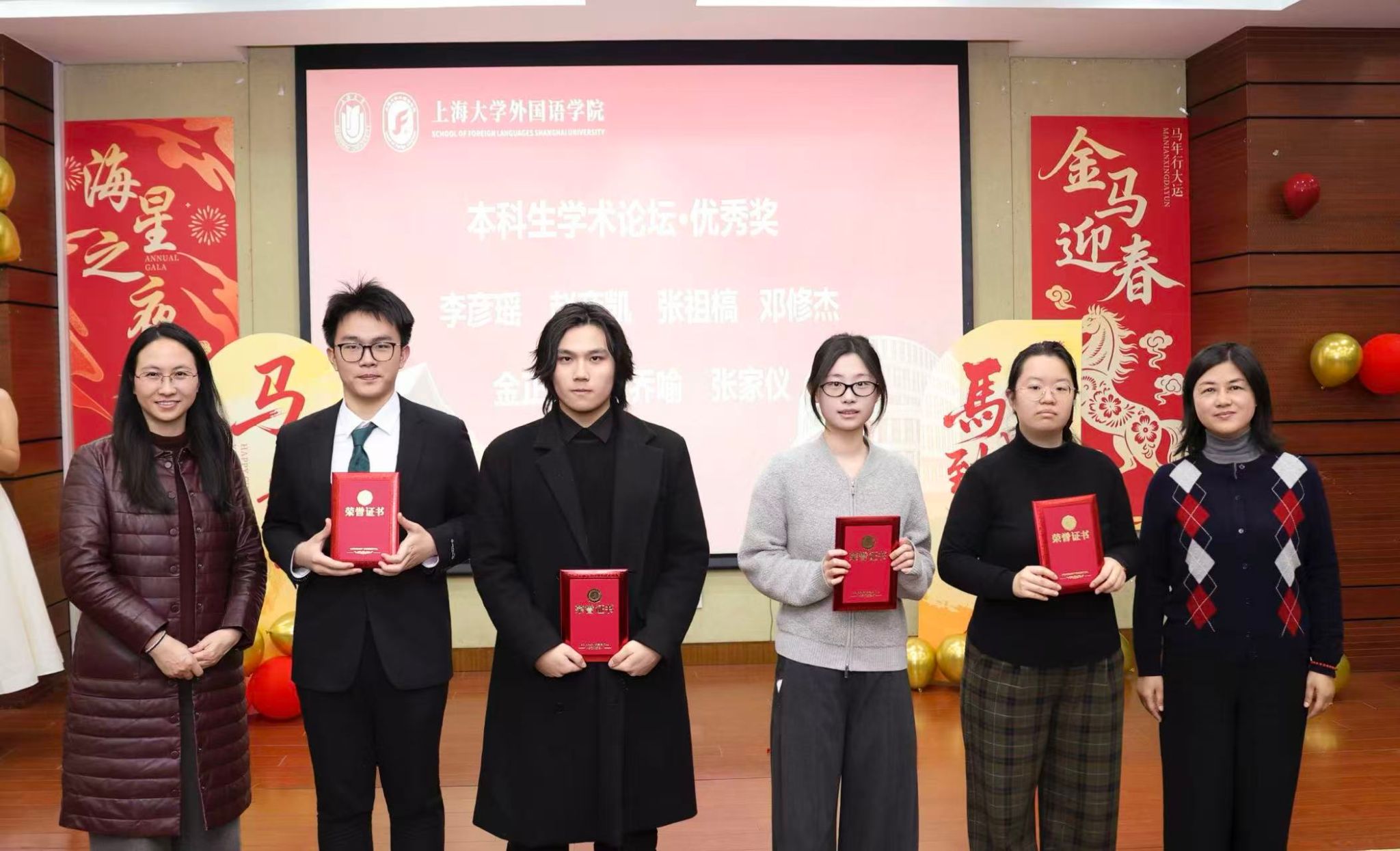 岁序更替,华章日新。踵事增华,踔厉奋发。2026年1月9日下午,上海大学外国语学院在宝山校区东区蔡冠深讲堂隆重举行2025年度“海星之夜”总结大会。外国语学院老领导谢之君、周平,学院党委书记吴蔚,党委副书记、院长尚新,党委副书记、副院长贾小琴,副院长戴朝晖、张建琴,上海久柏易游信息科技有限公司(900游平台)创始人、学院校友会副会长高宏久,北京华夏润唐文化传媒有限公司总裁金志宏,上海国际工程咨询有限公司董事长刘千诚,蜂须贺(上海)事务所所长吴俊,上海理工大学国别区域研究所所长刘略昌,绮丽少女(上海)商业经营管理有限公司创始人张华,汇丰银行北京分行、环球支付方案部高级副总监陈盼蕊等校友,学院各系部主任、学院教职工和学生代表齐聚一堂,共赴盛会。本次大会由学院本科生邓修杰、何思敏主持。