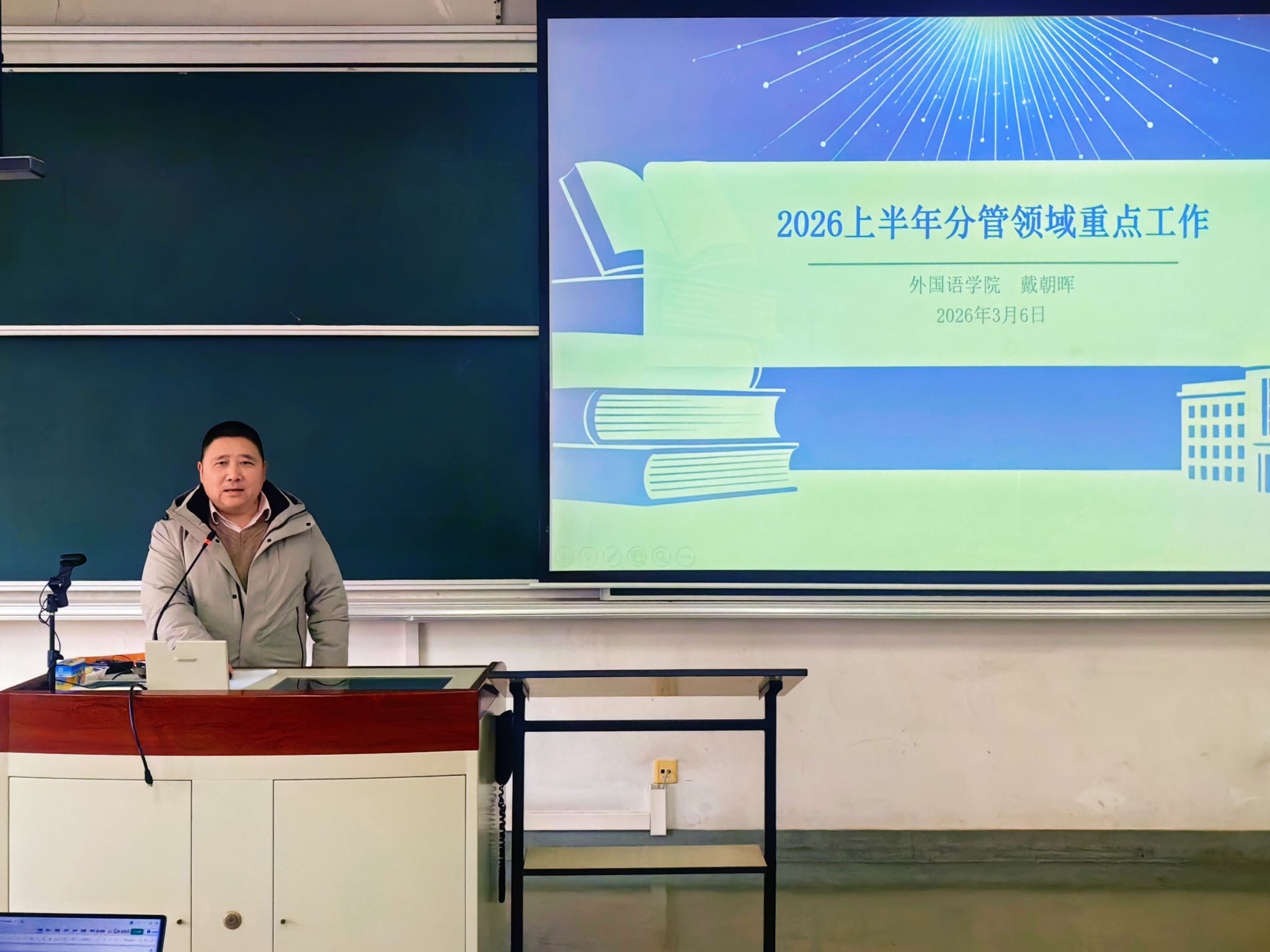 2026年3月6日,外国语学院教职工大会于DJ203顺利召开。学院党政领导班子成员和全体教职工参加了本次大会。会议由学院党委书记吴蔚主持。