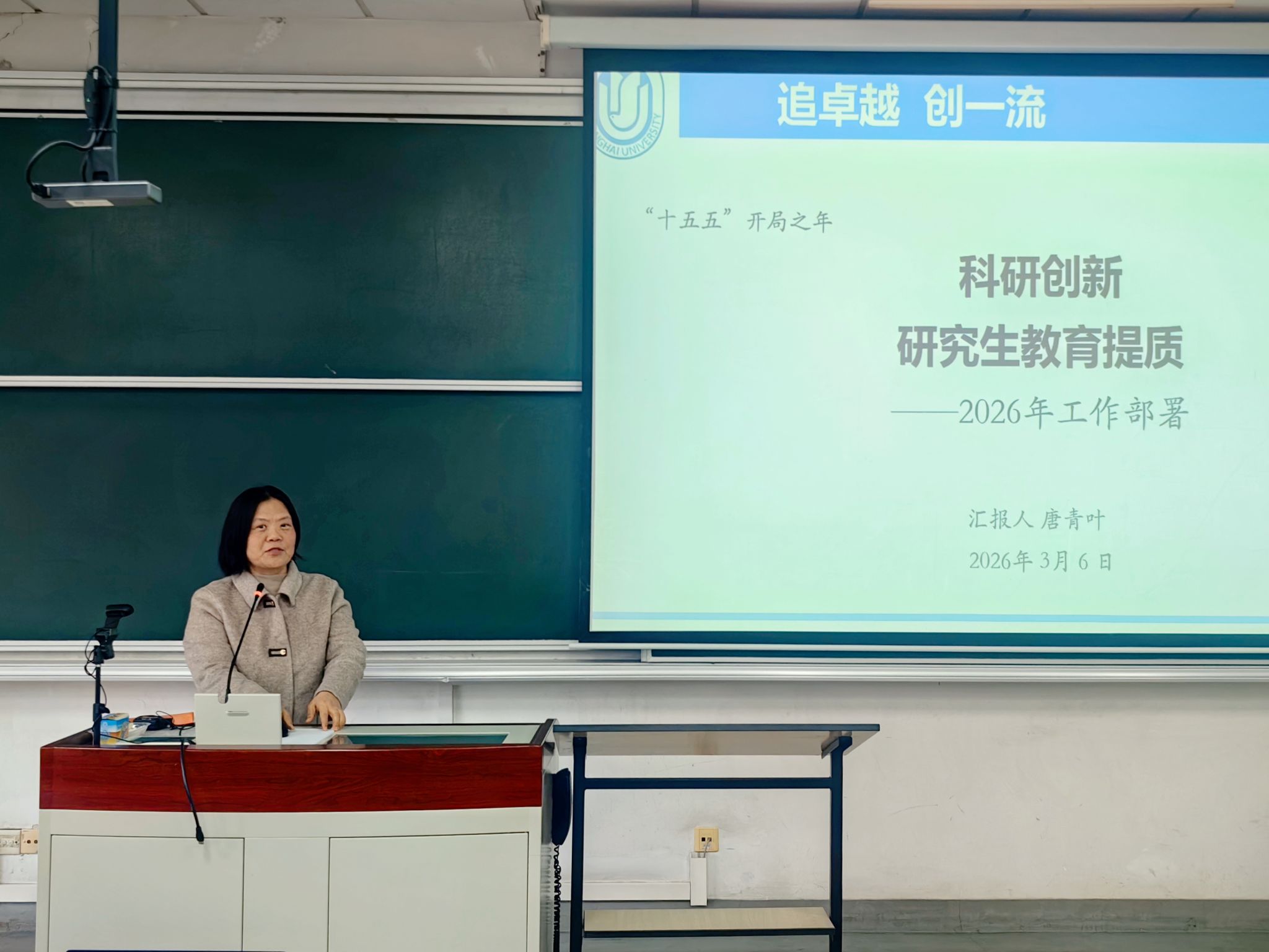 学院副院长唐青叶对2026年科研与研究生教育工作做了详细规划。她强调科研是学科发展的核心动力,鼓励教师申报各类纵向、横向科研项目,凝练契合国家战略与学科趋势的选题,加强团队建设与项目攻关,并号召大家积极参与即将举办的《上海翻译》创刊40周年纪念学术研讨会、第六届儿童语言习得论坛以及第二届中国-葡语国家文明互鉴学术研讨会等学术活动。研究生教育方面,她详细介绍了研究生全过程培养的相关要求以及硕博士研究生招生的时间节点安排,呼吁老师们积极投入研究生招生和宣传工作指出当前学院面临生源减少的压力,呼吁全体教师积极参与研究生招生工作,加大宣传力度。同时发动研究生导师支持和指导学生的创新创业大赛。最后,她提醒大家注意学术诚信和AI使用规范,强化学风建设与学术诚信教育。