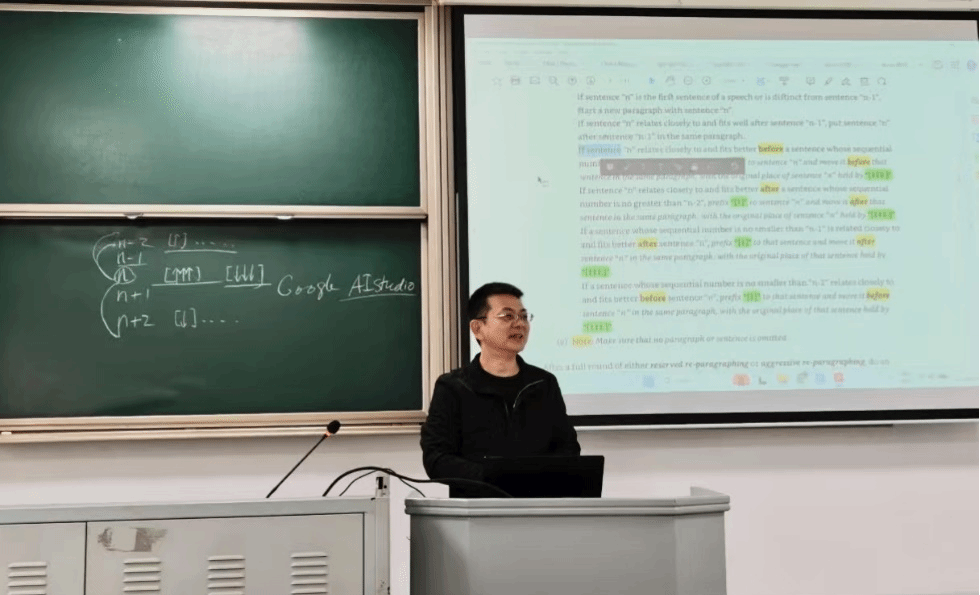 下午场讲座(第四十三讲)以“人工智能时代译者的复合型能力构建”为题,黄文新先生结合自身在联合国系统多年的翻译与编辑经历,深入剖析了当前翻译工作面临的核心挑战。他指出,随着AI翻译工具的普及,译者不仅要掌握传统语言技能,更需具备精准解析文本、撰写高质量提示词以及主动利用AI扩展能力边界的综合素养。针对当前AI翻译应用中的“幻觉”问题,黄文新先生结合联合国文件翻译进行了深入剖析,强调建立“人机结合”质量控制流程的重要性。同时,他围绕精细化提示词的设计与应用展开讲解,提出在提示词中明确AI的角色定位、核心任务、文本类型、语言风格、分段规则及编辑原则等核心要素,确保AI产出符合专业要求的翻译成果。此外,黄文新先生还系统梳理了专业翻译与编辑的全流程规范,包括段落重构的操作步骤、专有名词的标准化处理、事实核查与语法修正等核心要求。针对编辑任务,他引入了“六维分析模型”,要求从可能性、有效性、得体性、问题原因、风险及改进方式六个维度,对每一处词汇修改进行详细阐述,为编辑工作提供了科学、系统的分析框架。