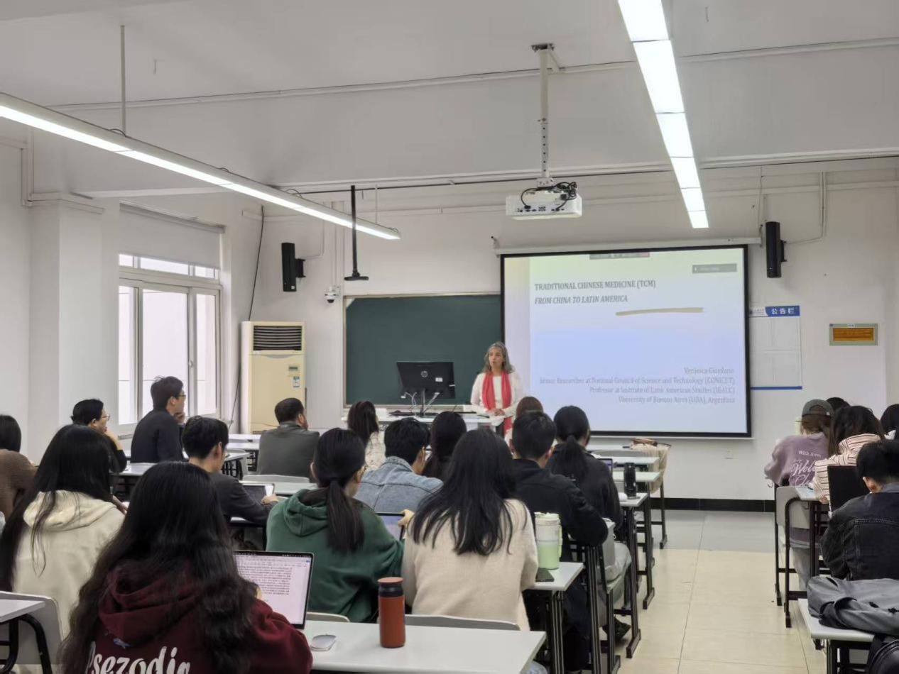 2026年4月16日下午,外国语学院特邀阿根廷布宜诺斯艾利斯大学社会学家、阿根廷国家科学技术研究委员会(CONICET)首席研究员维罗妮卡·吉奥达诺(Verónica Giordano)教授,在嘉定校区做了题为《传统中医的全球实践:中医在拉丁美洲的传播与在地化路径》的英文讲座。讲座由上海大学葡语国家区域研究中心、上海大学全球问题研究院拉丁美洲研究中心联合主办,上海大学外国语学院唐青叶教授主持,来自校内外50余名师生参与交流。