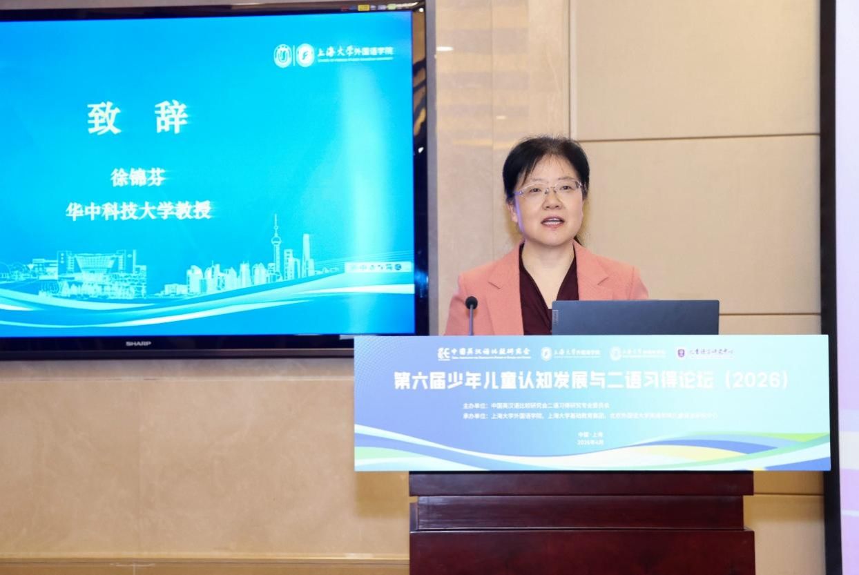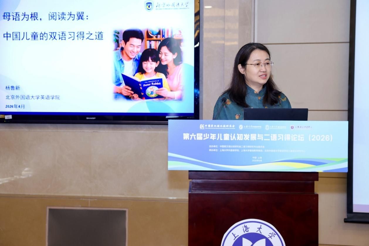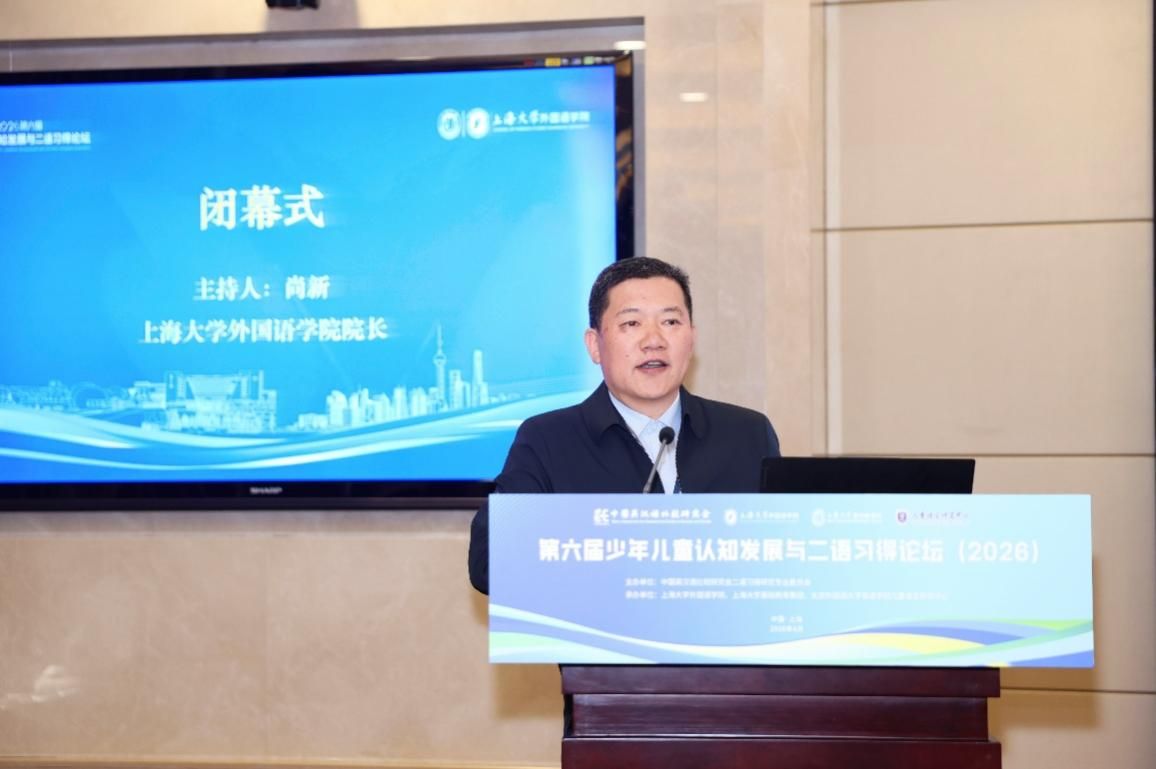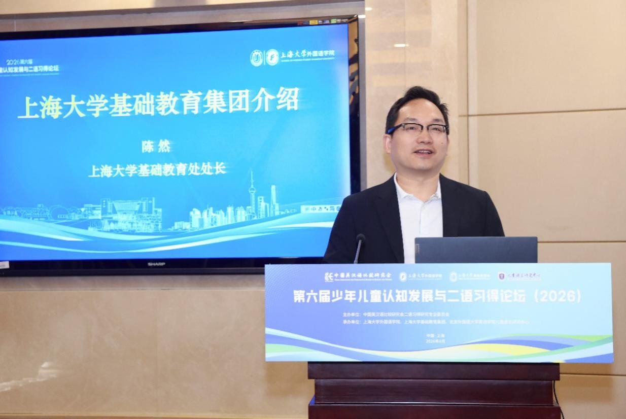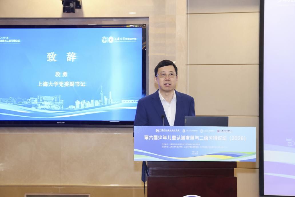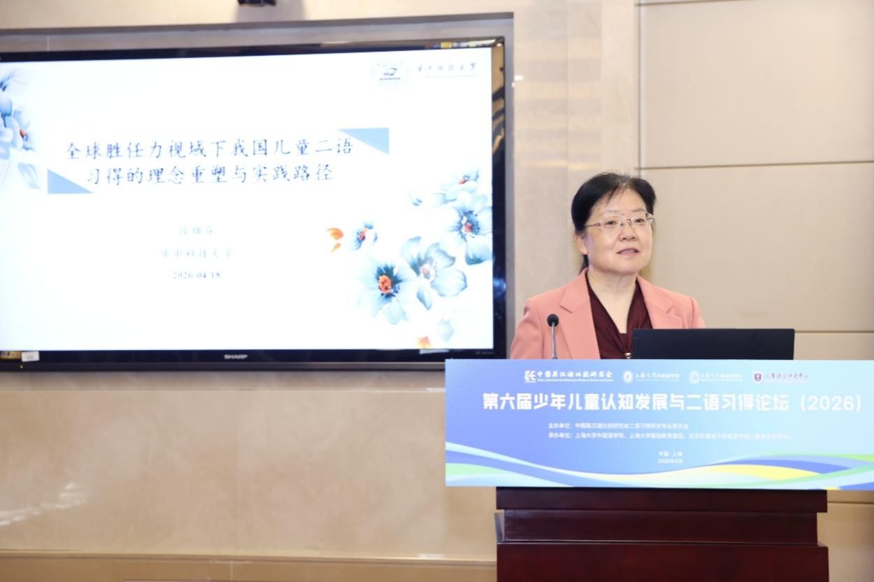 2026年4月18日至19日,由中国英汉语比较研究会二语习得研究专业委员会主办、上海大学外国语学院、上海大学基础教育集团与北京外国语大学英语学院儿童语言研究中心联合承办的“第六届少年儿童认知发展与二语习得论坛”在上海大学宝山校区乐乎新楼学海厅隆重举行。中国英汉语比较研究会二语习得研究专业委员会主任委员、华中科技大学徐锦芬教授、北京外国语大学英语学院院长杨鲁新教授、重庆大学未来教育研究院院长彭静教授、华东师范大学邹为诚教授、郭宝仙教授、上海市闵行区纪王学校张莉副校长、北京外国语大学英语学院儿童语言中心主任陈亚平、副主任王一虹和盖淑华等嘉宾出席此次论坛,上海大学党委副书记段勇、基础教育处处长陈然、副处长肖青峰,外国语学院党政领导系部主任及师生代表以及来自全国高校、科研机构及中小学的专家学者、一线教师、研究生等近百名代表齐聚一堂,围绕儿童认知发展规律与外语学科素养培育,共同探讨儿童二语习得的新趋势、新问题与新机遇。开幕式由上海大学外国语学院院长尚新教授主持。
