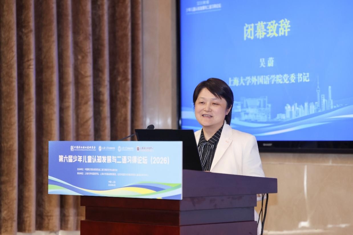 4月19日中午,论坛闭幕式在乐乎新楼学海厅举行,闭幕式由上海大学外国语学院院长尚新教授主持。下一届论坛承办方重庆大学外国语学院代表彭静教授发言,她热情欢迎各位专家学者2027年相聚山城重庆,共同参与“第七届少年儿童认知发展与二语习得论坛”,并介绍了论坛的大致考虑和初步安排。最后,上海大学外国语学院吴蔚书记代表承办单位致感谢辞,她对专家和参会学者表示衷心感谢,表示本次论坛取得圆满成功和专家们高水平的专业报告包括以及参会学者们的积极参与、无私分享和倾力付出密不可分。她指出,本次论坛聚焦儿童认知发展与二语习得的前沿议题,既有理论高度,又有实践深度,为我国少年儿童外语教育事业的发展注入了新的活力。