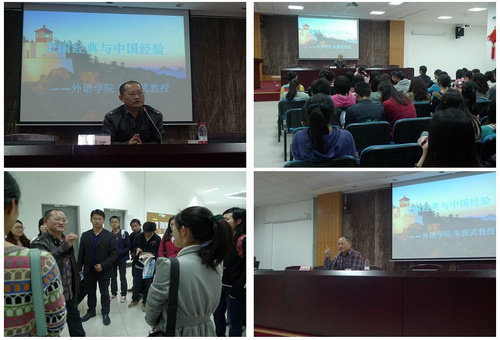 讲座中,朱教授就美国与中国对待文化经典的不同态度进行对比,通过"哪个国家的言论更自由?"、"哪个国家的学生更尊师重教?"等问题引导同学们对中美两国文化发展的现状进行深入思考。他指出,"社会越成熟,暴露的问题就会越多,就越接近死亡。当财富积累到一定程度时,人们终究会意识到,精神上的虚无有多么可怕。"他从海明威的《杀手》联想到佛山小月月事件,从文化的角度反思物质文明高度发达的现代社会中人的麻木。