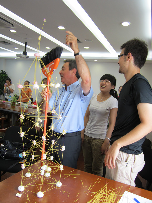 最后,教授拿出自备的棉花糖以及意大利面,让学生分组建塔,看哪一小组的塔最高最稳固。学生们需要进行沟通,说服组员采取自己的方式去建塔。通过这样的游戏,学生们不仅玩得很有趣味,更重要的是,在具体的事件中学会如何沟通,如何谈判,最终达成共同的目的。