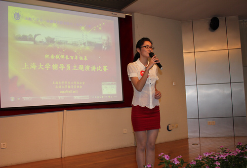 9月24日下午,以"纪念钱伟长校长诞辰100周年"为主题的上海大学第一届辅导员职业能力展示大赛之演讲比赛决赛在校本部行政楼报告厅隆重举行。外国语学院学工办辅导员余丽娜老师经过预赛的选拔成功进入12强,与来自不同学院的辅导员老师们展开精彩角逐。