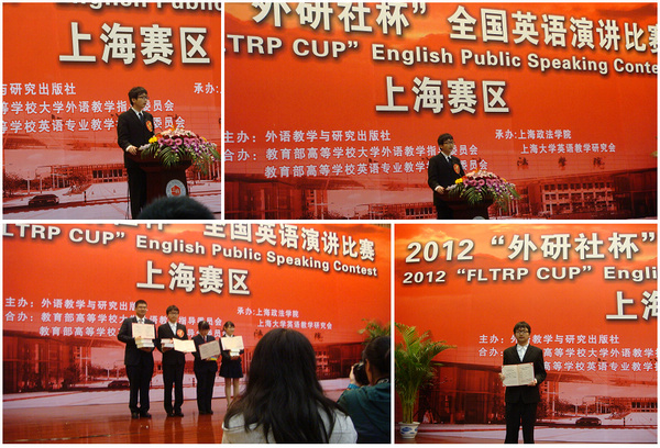 11月10日,2012年"外研社杯"全国英语演讲大赛(上海赛区)在上海政法学院天马讲堂隆重举行,外国语学院英语系2010级郑世奇同学代表我校参赛。来自复旦大学、华东师范大学、上海交通大学等23所高校的优秀选手展开激烈竞争,争夺晋级全国总决赛的席位。