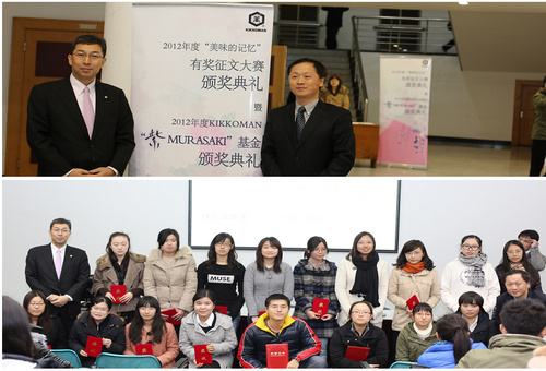 12月5日晚6点,2012年度"美味的回忆"有奖征文大赛暨2012年度KIKKOMAN"紫MURASAKI"基金颁奖典礼在我校行政楼报告厅拉开帷幕。龟甲万公司代表深泽晴彦先生、外国语学院副院长冯奇、日语系主任董永杰等出席了此次颁奖典礼。