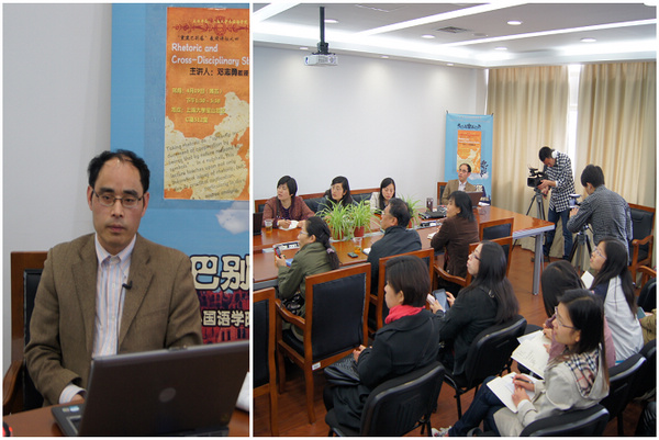 4月19日下午,外国语学院在C512举行了主题为"Rhetoric and Cross-Disciplinary Studies"的学术讲座。本次讲座为外国语学院"重建巴别塔"教授系列讲座的第四讲,由外国语学院邓志勇教授主讲,唐青叶教授主持,外国语学院教师和研究生参加了讲座。