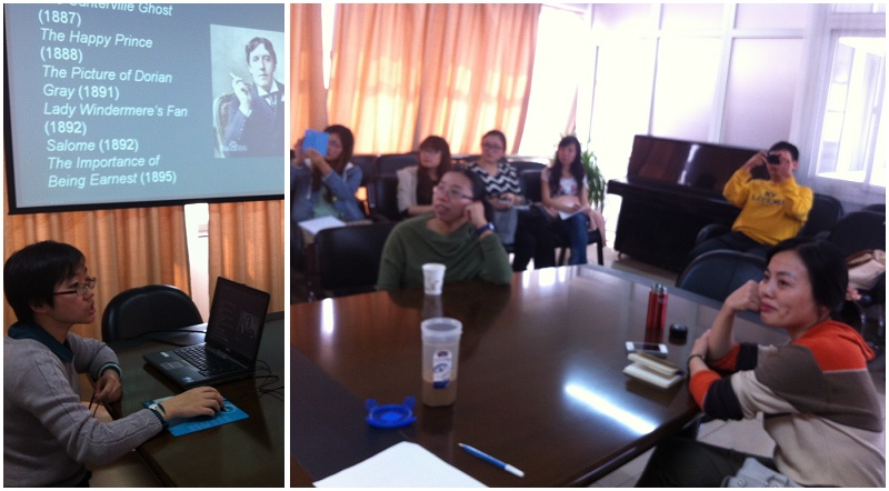 11月7日下午,外国语学院翻译沙龙在C五楼会议室举行"语境·译者·译文—王尔德作品在中国(1909~1949)"主题讲座,讲座由袁丽梅博士主讲,我院教师和研究生参加了讲座。