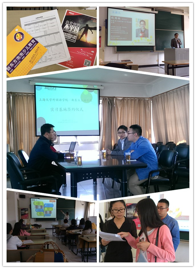 2012年,上海大学外国语学院与新东方上海学校校企联合,签约共建实习基地。两年来,外语学院一直和新东方保持良好的联系和互动交流,每年新东方上海学校都会来我校进行宣讲介绍,我院每年也都会有部分毕业生成功进入新东方上海学校任教或担任行政职务。10月17日下午,为了进一步深化我院和新东方的友好合作,双方续签了继续共建实习基地的协议。