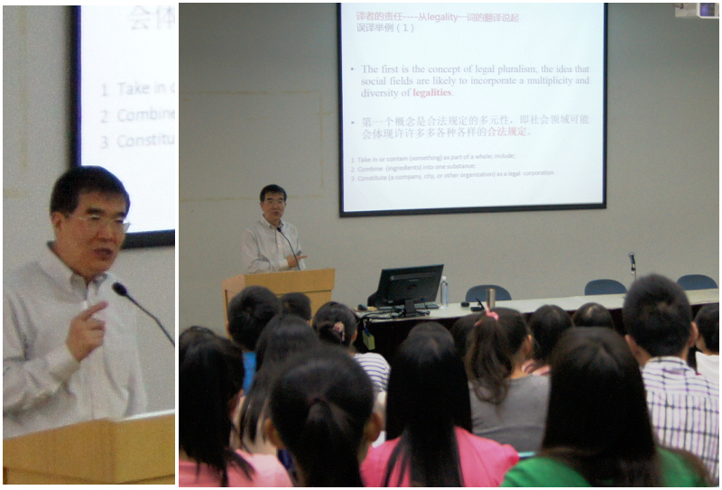 叶教授的讲座主题为"译者的责任——从legality一词的翻译谈起"。讲座由误译举例、原因分析、解决之道以及译者的责任等四个部分组成。叶教授列举了详细的翻译误例,指出了错误的原因,提出了每个错误的改正方法,并在此基础上从翻译的质量、国家对翻译人才的需求以及翻译者本身需要做的努力三个方面强调了译者的责任。