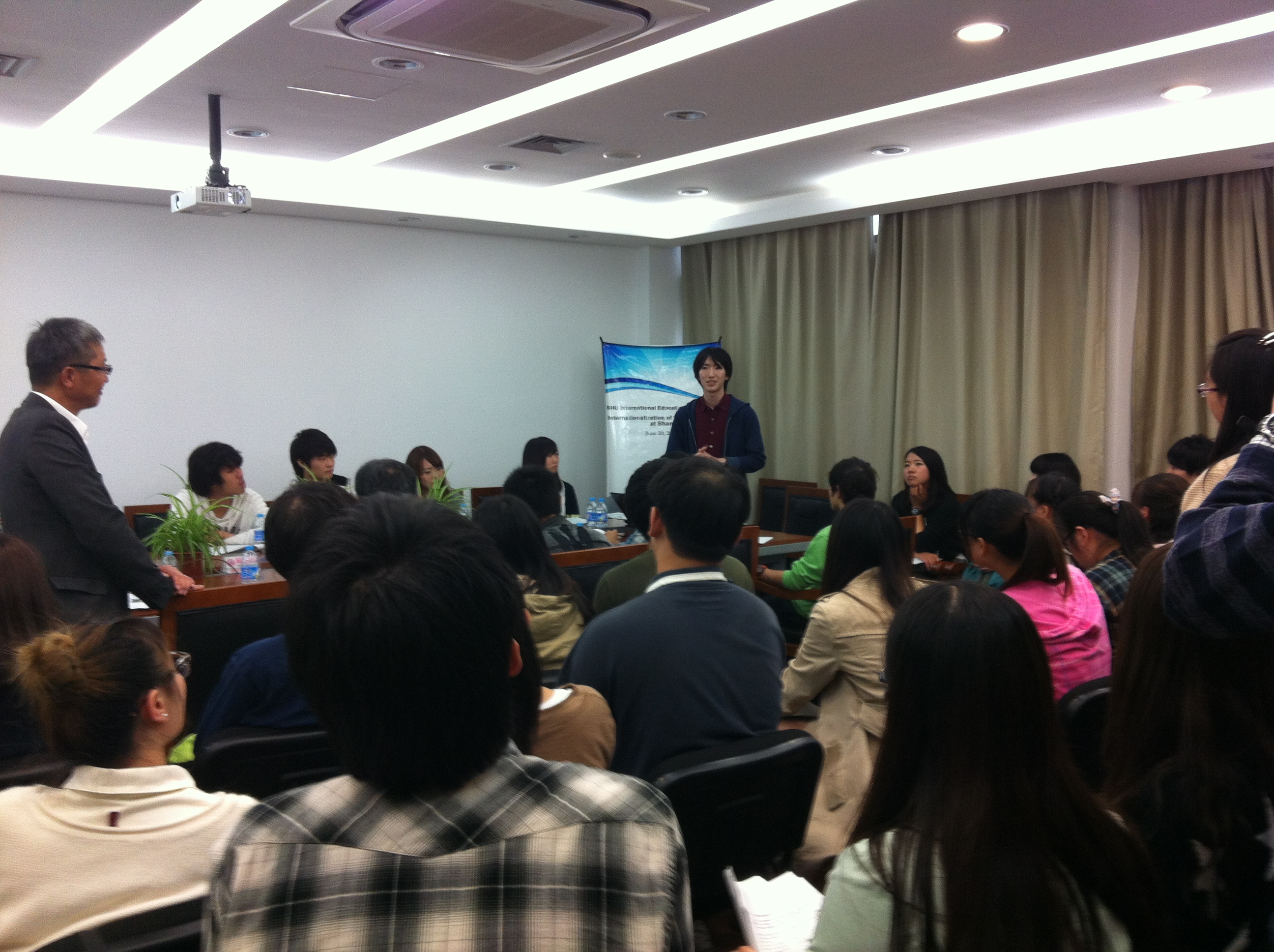 下午一点半,双方首先于C512开展学生演讲活动。富山大学铃木瑛一、竹田怜生、深谷拓磨等同学分别就《便利商店产业差别性》、《日本与美国节能政策的实用性比较研究》以及《日本人工作满意度与教育问题》为课题做演讲。演讲内容丰富深刻,引起了同学们的热烈讨论,大家纷纷就课题提出问题或见解,现场学术气氛浓厚。随后,我校张毅同学分享在日本BSC的宝贵经历;曾在富山留学的蔡丰衍同学也就《在日本所学》做了精彩生动的演讲。在近两个小时的演讲活动中,中日双方所选话题内容丰富精彩、形式生动多样,获得了在座师生的热烈掌声与一致好评。