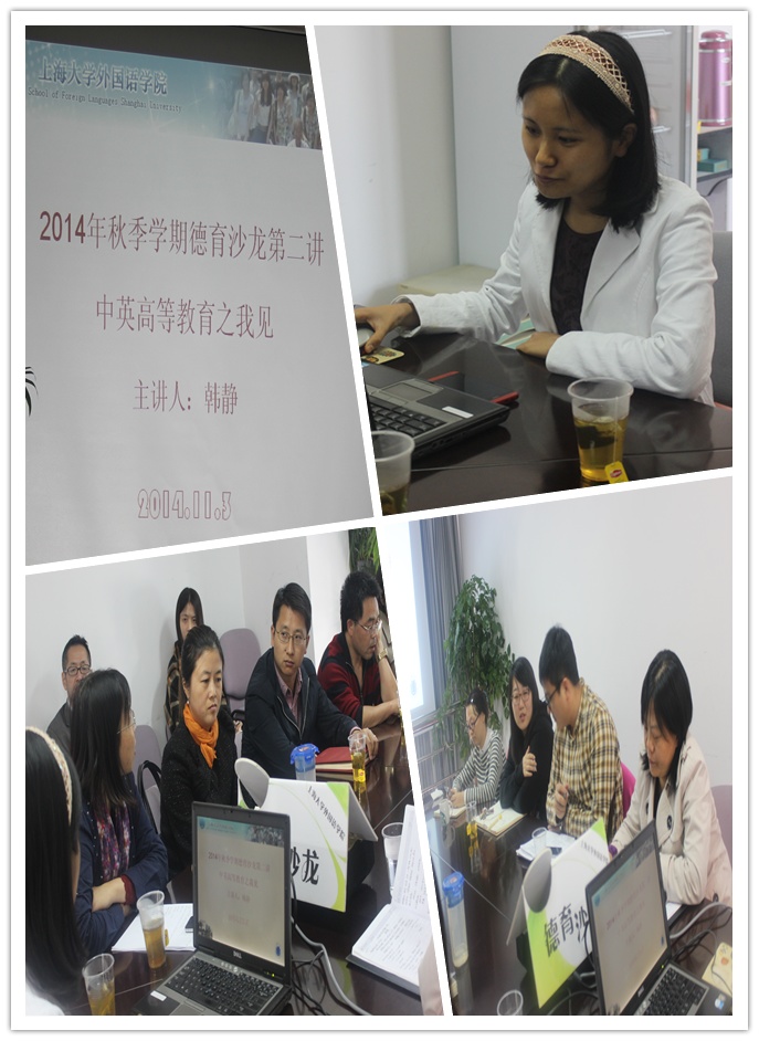 韩静老师首先从整体上简明扼要地概括了英国高等教育的四个特点——授课时间短、讲座和小组讨论为主、辅以实验室学习和以社会需要为考量,如此教育特点让人耳目一新。接着,她从入学条件开始详细地介绍,也向大家展示了英国唯一的私立大学,即白金汉大学,图文并茂,饶有趣味。在谈及中英高等教育在具体形式上的区别时,她解释说,英国大学较之我国大学在学位获得的年限上有一定的差别,配以图表呈现,让在座老师一目了然。韩静老师还向我们讲述了英国高等教育中另一种形式——sixth form,旨在以职业导向和考取证书为教育指南。此外,她还提到,英国启发式、对话式的教学方法在一定程度上与我国传统的灌输式和独白式存在差异;在论文写作上,她以自己从师的亲身经历指出,中英高等教育在对学生理解问题能力和发现问题能力的处理上也有不同侧重;在治学精神上,她表示,英国教育比较注重师生平等和学术严谨。总结时,她还特别提到,英国互动式教学方法和高密度的知识传授以及富有人性化的"学生手册"让她印象深刻。