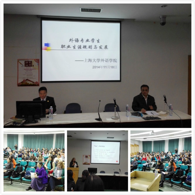11月18日,由外国语学院研究生创立的学术品牌活动"桂冠讲堂"第三讲在J101顺利举办。讲座由上海外服国际人才培训中心主任陈养铃老师主讲,外国语学院冯奇教授主持。本次讲座同时获得上海大学研究生"泮池言学"活动资助。