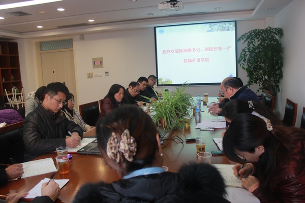 学院书记施雯从学生各类课外实践平台的搭建、优秀学生考评体系、学院系统工程建设等方面与来访领导进行了交流探讨;日语系主任董永杰、英语系副主任张建琴分别就日语、英语专业学生培养特色,大类招生后专业教学中所遇到的问题和困惑与徐书记沟通,徐书记充分肯定了我院两个专业的教育教学成果,并从学校整体发展规划的角度为我们提出了很多切实可行的建议。随后安山老师根据自己受组织部委托到外语学院工作一年半来的亲身体会,表达了对外语学院教师积极、努力工作的肯定。