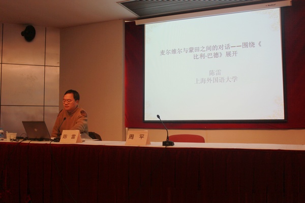 2014年12月19日上午,第六届上海大学外国语学院学术节在宝山校区行政楼报告厅如期举行,学院领导以及广大教师代表、专业研究生们共同迎来了我院一年一度的学术盛宴。来自上海外国语大学文学研究院的教授陈雷博士受邀出席并发表了以"麦尔维尔与蒙田之间的对话--以《比利·巴德》为例"为题目的报告。陈雷教授认为,美国19世纪作家麦尔维尔的作品主题与法国文艺复兴后期人文主义思想家蒙田的怀疑论观点存在着一定的互文性,并借助麦的小说《比利·巴德》中三个主要人物展开了关于人性中"恶"之本质的探讨。他从古典理论出发,指出正义与非正义,也即善恶之分体现为对于等级秩序的遵循或颠覆,进而引申到蒙田思想中"恶"来源于人的理性内部,是一种堕落腐败的理性。陈雷教授最后总结道,关注人性之"恶"在当下仍然有深刻的启示意义,人们不能滥用和放纵理性的欲望;自然状态下的人应是理性与感性的结合、力与美的结合。报告结束后,陈雷教授与在座的师生进行了精彩的问答互动。