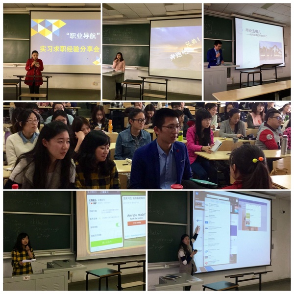 4月22号下午4点,外语学院职业导航月系列活动第二弹--实习经验分享会在DJ303顺利举行,4位已被德勤、上海通用、兴业银行等知名企业签约或录取实习的优秀学长学姐卢旭栋、骆艺榕、施文仪、钱贝妮和大家分享了自己独特有效的求职经验,我院研究生、本科生约70人参加了此次分享会。