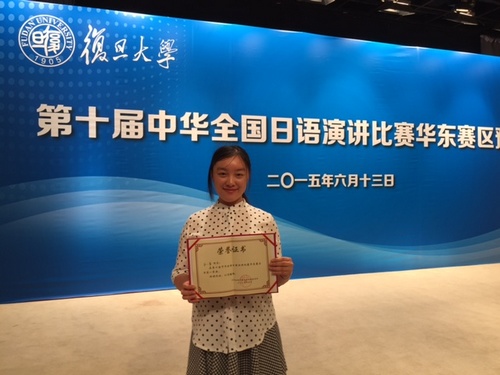 "中华全国日语演讲比赛"是由中国教育国际交流协会与日本经济新闻社、日本华人教授会议合作共同举办的一场日语演讲比赛。自2006年开始,今年已是第十届。5月起便开始在全国各地,包括北京、华北、东北、西北、华中、华东、华南和西南八个分赛区先后开赛。华东赛区参赛的学校有:复旦大学、上海外国语大学、上海大学、江南大学等21所来自上海市和江浙等地的高校。比赛由命题演讲和即席演讲两部分构成,两部分的成绩加起来,决出一二三等奖。杜一苇同学凭借出色的口语,流利的谈吐,获得了在场评委的高度赞赏,最终斩获了一等奖。