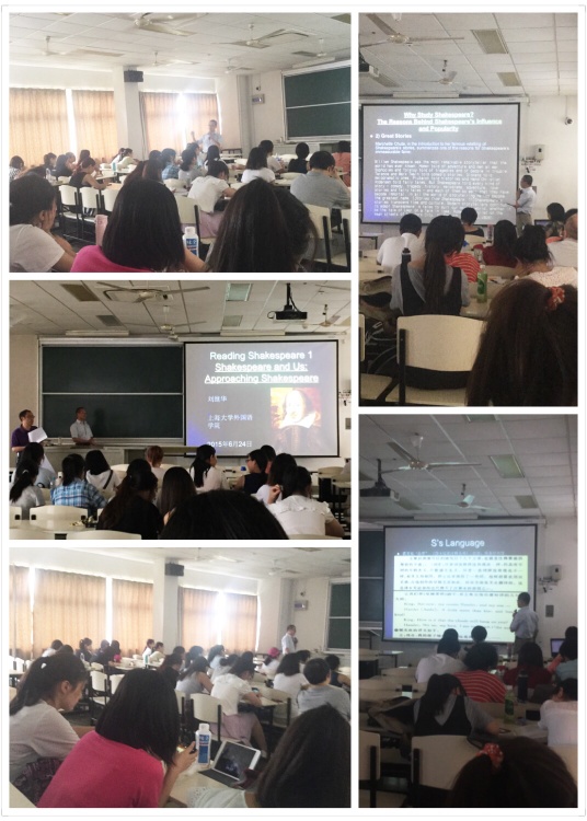 6月24日下午1:30,上海大学外国语学院"走近莎翁步入经典——莎士比亚文学中的人生与美学系列讲座" 第一讲:莎翁与我们—走进莎士比亚在CJ304顺利举行。此次讲座由外语学院副院长邓志勇教授主持,外院近百名学生和老师到场聆听。来自宁波大学的刘继华博士在短短的一个半小时内为大家呈现了一场丰富的文化盛宴。