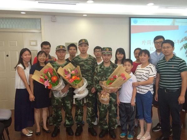 9月21日,外国语学院2015年大学生应征入伍欢送会在C楼512会议室举行。外国语学院院长周平、党委副书记王国建、团委书记王杰以及家长代表和同学代表参加了欢送仪式。欢送会由辅导员邹琴老师主持。