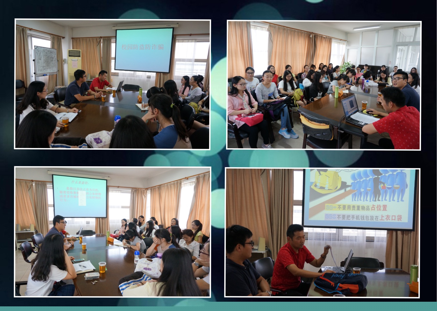 他从平安校园防盗教学之教室篇、食堂篇、地下车库篇、寝室篇四个方面提醒大家时刻防盗,并给出了防盗、保管财物的具体方法和措施。过程中,崔老师同王杰老师配合,亲自表演财物被盗过程,生动形象,引得会场欢声一片。他还特意强调学校的草坪也是小偷下手点之一,提醒大家在与亲友放松小聚的同时,不要忽略对自身财物的看管。