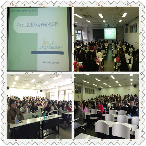 细雨蒙蒙,天气转凉,2015年的寒冬已然到来,随之而来的,还有严峻的就业寒冬。为了引导2016届毕业生们正确面对就业压力,11月22日下午,外国语学院特意邀请了上海大学就业办就业科王平老师开展了题为"毕业生就业形势和就业流程"专场讲座。学院2016届毕业生们齐聚一堂,认真聆听了王平老师丰富的经验指导。