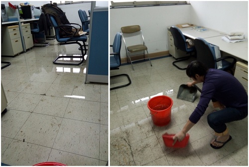 另外,由于12月9日夜间上海突遇罕见的冬季大雨,外国语学院所在的C楼教学楼屋顶因下水口被堵,淤积的雨水渗漏到了四楼各办公室内。所以当10日一早上班在运送完上千袋旧试卷后,院办的黄澄老师和王新中老师就拎起水桶、拖把和畚箕来到C楼四楼教师办公室进行清理,完全靠手工作业畚箕抄水的方式将办公室地面约有五、六十桶的积水全部清空,最后用拖把拖干净地面。期间得到了李津老师的大力协助,还提供了可甩干式拖把吸水拖地,大大提高了工作效率。