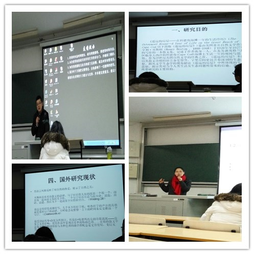 之后,2014级英语语言文学硕士研究生张航、程怡云,2014级外国语言学及应用语言学硕士研究生宋亚丽分别进行了开题示范。张航同学的论文是根据美国作家亨利·贝斯顿的著作《遥远的房屋》展开,其论文题目是《< 遥远的房屋>的文学生态学研究》,其开题报告从研究目的、研究意义、研究方法、国内外研究现状、研究框架、参考文献等方面进行了说明。程怡云同学的论文题目是《二战阴影下的反思与救赎——麦克·尤恩< 黑犬>之主题研究》,其论文从"黑犬"与历史暴力、人类文明的哲学思辨、历史的反思与文明的救赎等方面展开,她将深入分析麦克·尤恩对于战争阴影下人类文明该何去何从的探寻,与此同时以史为镜,在已有研究的基础上进一步挖掘该作品在现今依旧复杂的国际政治历史局势中的意义与启示。宋亚丽同学的论文题目是《政治话语的批评话语分析——以中国领导人在联合国的发言为例》,其开题报告介绍了论文引言、文献综述、理论框架、联合国安理会发言稿的批评话语分析、结论与启示、参考文献等。
