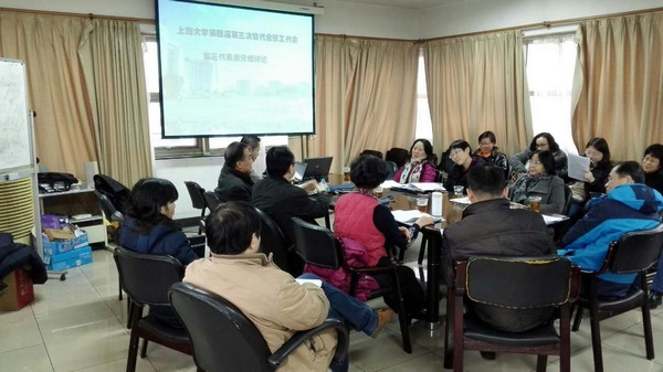 1月13日下午,由外国语学院、国际交流学院、悉尼工商学院和中欧学院四个单位组成的上海大学第四届教职工代表大会第三代表团在新校区C501召开讨论会,共有36名正式代表和5名列席代表出席了会议。
