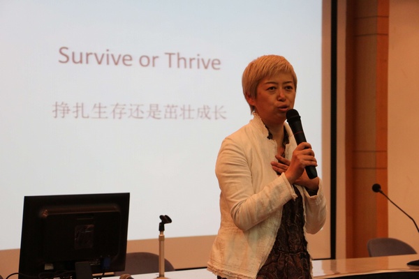随后,周从意女士从柯达公司市值变化、金融行业的巨变以及奢侈品行业的竞争态势等为同学们讲解新时代的学习观和择业观,鼓励同学们"敢说,敢做,敢争取,敢表现,"尽早规划人生,筑梦未来。周女士曾任迪士尼中国区人力资源负责人、世界著名奢侈品牌杰尼亚大中华区人力资源负责人、亚太地区销售能力优化部门负责人等。她以丰富的职场经历、生动的案例和频繁互动让同学们明白,在当下人人要竞争的时代,如果要thrive(茁壮成长),跨界学习必不可少,同时"学以致用和学非所用同样精彩"。在问答环节,同学们踊跃提问,就学历与能力、实习单位的选择等问题向周老师求教,"海星讲坛"第一讲在热烈的掌声中落幕。