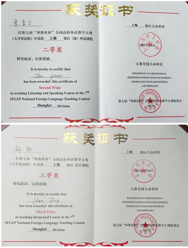 上海大学外国语学院朱音尔与韩静两位青年教师在学院选拔中脱颖而出,分别参加上海赛区听说组和综合组复赛。经过激烈的角逐和比拼,朱音尔博士在复赛授课环节中以精巧的课堂设计、真实灵活的师生活动获得评委好评,以第三名的成绩进入决赛,最终斩获上海赛区听说组二等奖。初涉教坛的韩静博士也向同行们展示了以理念带设计、以设计促互动的优秀课堂,最终荣获综合组三等奖。此次赛果充分体现了外院教师在外语教学中出色的创新理念、灵活熟练的课堂掌控能力和扎实的学科基本功!